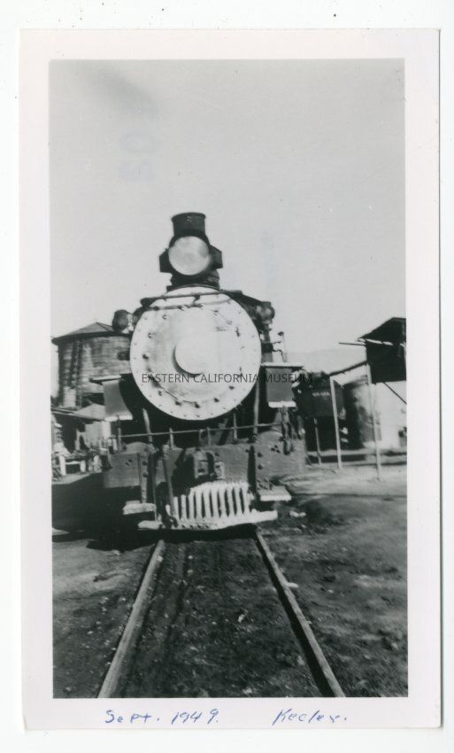Photo of the front of a Southern Pacific train engine (cannot read number). There appears to be a water tower behind it to the left. It is labeled on the front in blue ink "Sept. 1949 Keeler."