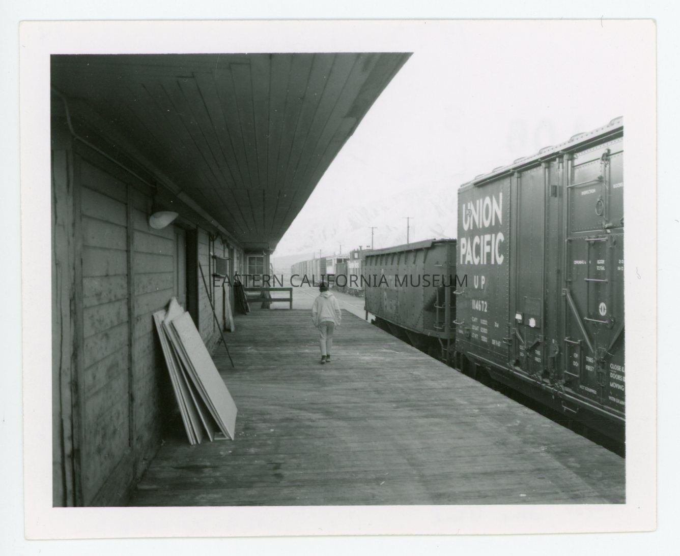 1972.61.26--Photo of a young child walking along the loading platform of a station depot building next to a Union Pacific boxcar. Same image as 1972.61.15.