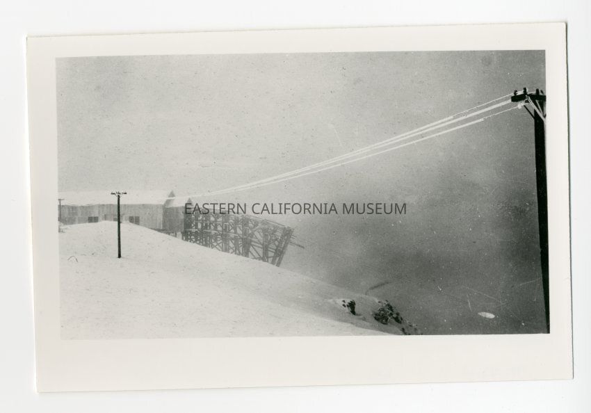 Photo of the summit station of the Saline Valley Salt Co. aerial tramway during a winter snowstorm. Powerlines are visible in the foreground.Collection