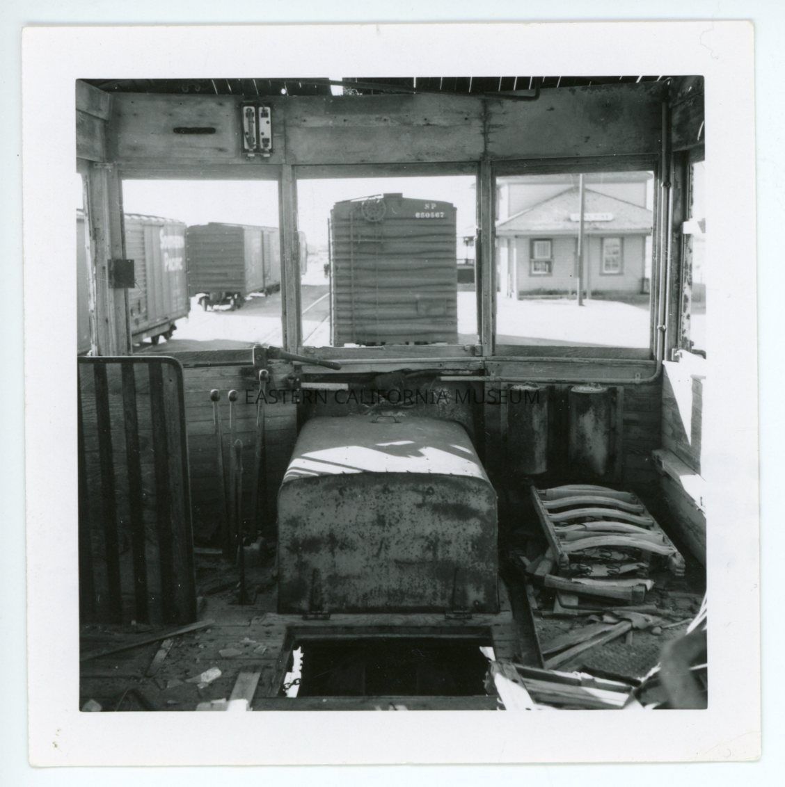 1972.61.13--Photo taken from the interior of a train car looking out the front windows. There are levers visible inside and outside is a station depot building and several boxcars.