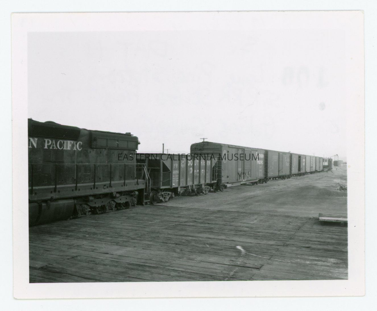 Written in pencil on reverse: Lone Pine Station, SPRR standard gauge freight train (taking "Galloping Goose" to Laws).