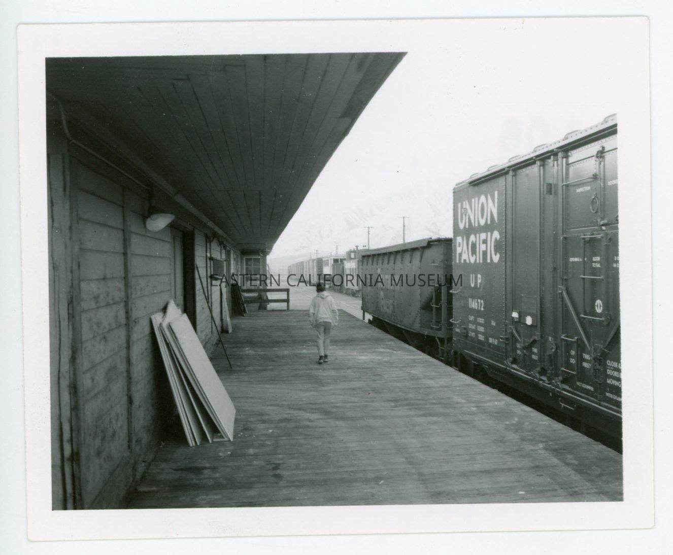 1972.61.15--Photo of a young child walking along the loading platform of a station depot building next to a Union Pacific boxcar. Same image as 1972.61.26.