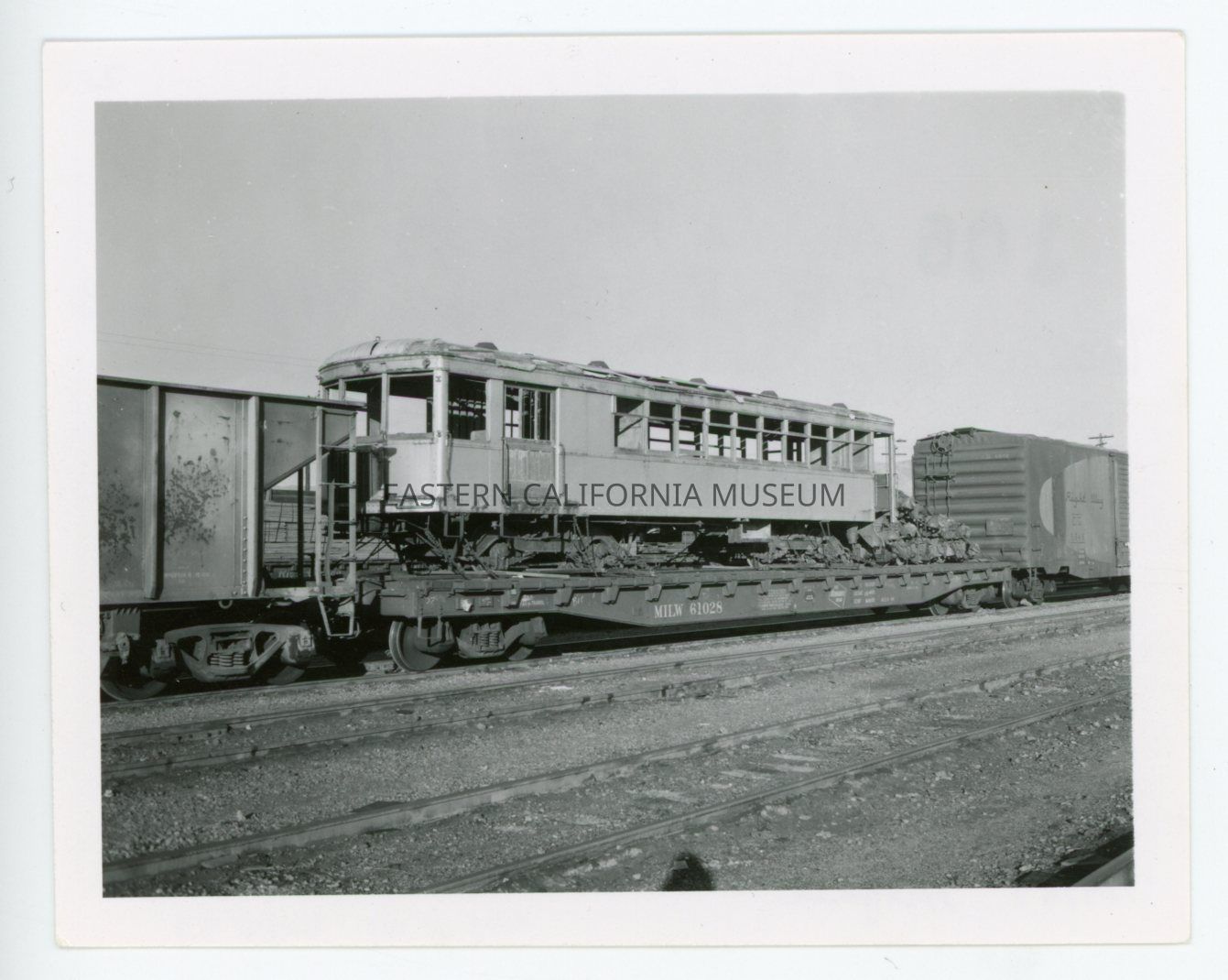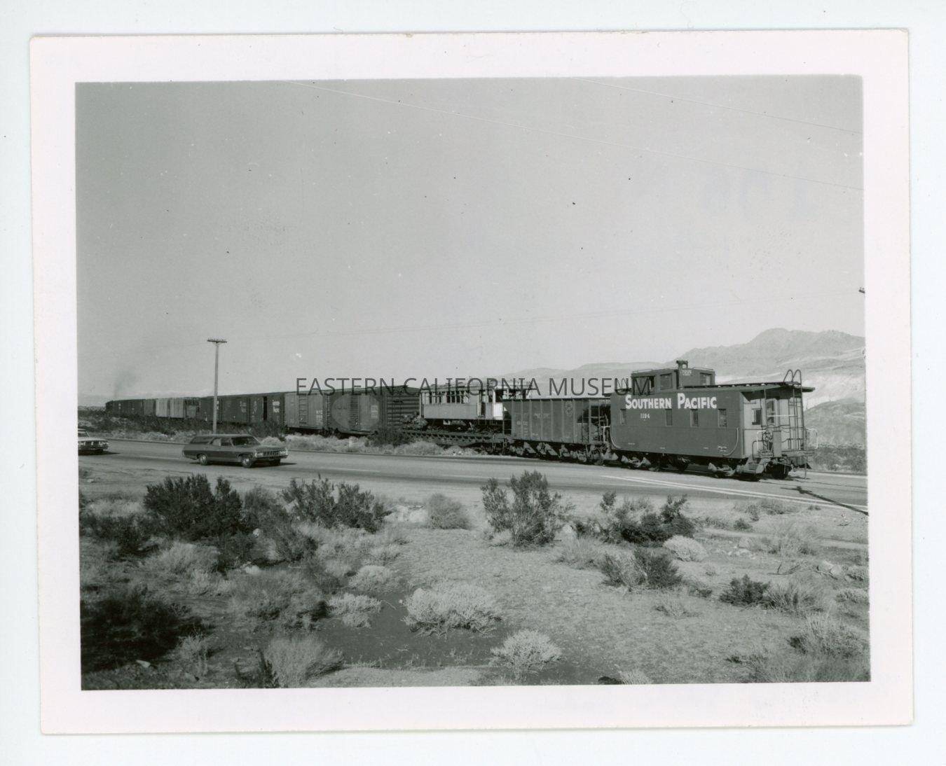 Written in pencil on reverse: Little Lake Area, SPRR Standard Gauge Freight Train, Inyo Mountains, Death Valley Railroad "Galloping Goose" or Motorized Unit Car (on way to Laws RR Museum).