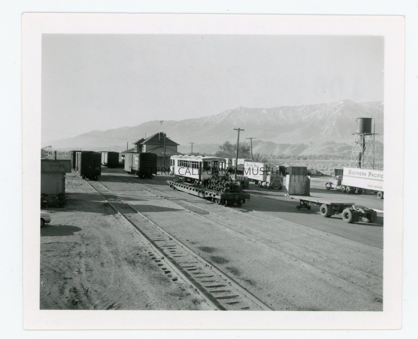 Written in pencil on reverse: Mojave RR yards, SPRR standard gauge freight cars, Death Valley Railroad "Galloping Goose" or Motorized Unit Car (being transported to Laws).