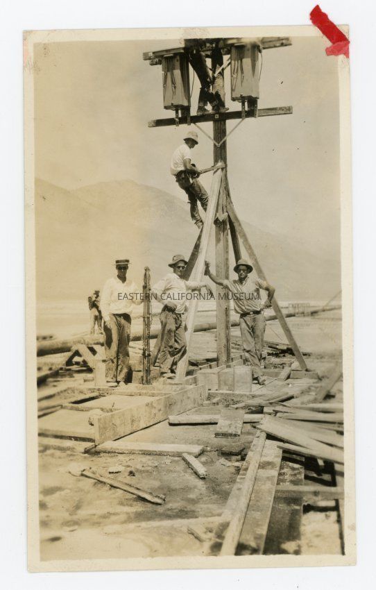 Photo of a group of four men (fifth in the background and sixth on top of the pole) working on a power pole near Owens Lake. They are likely LADWP employees constructing power lines.Collection