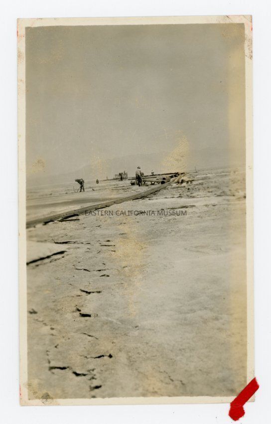 Photo of men working on the dry lakebed of the Owens Lake. They are likely LADWP employees constructing power lines.
