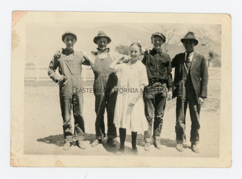Photo of group of five young people, four boys and a girl. They are outside, and a fence, structure, trees, and mountains are faintly visible in the background.Collection
