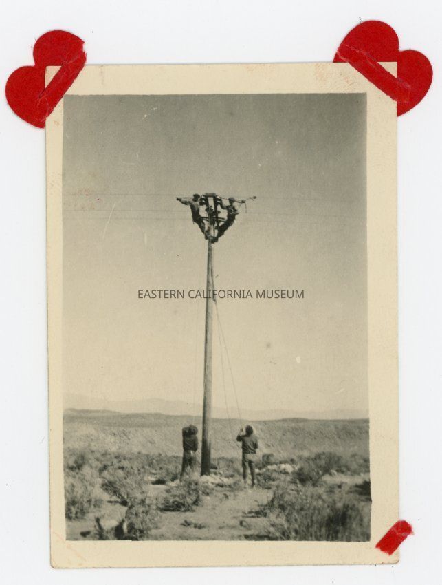 Photo of a several men working on and around a power pole. They are likely LADWP employees constructing power lines.