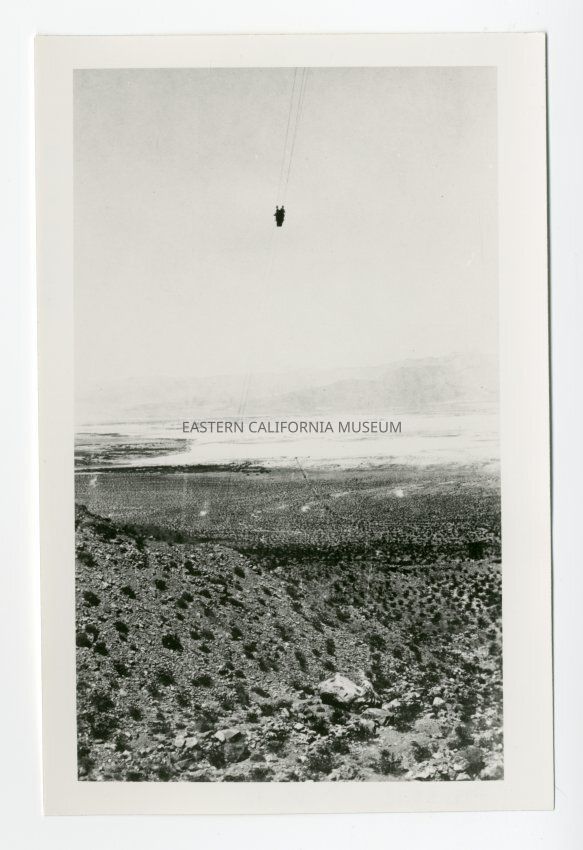 Photo of the Saline Valley Salt Co. aerial tramway cables transporting construction materials. Saline Valley visible in background.Collection