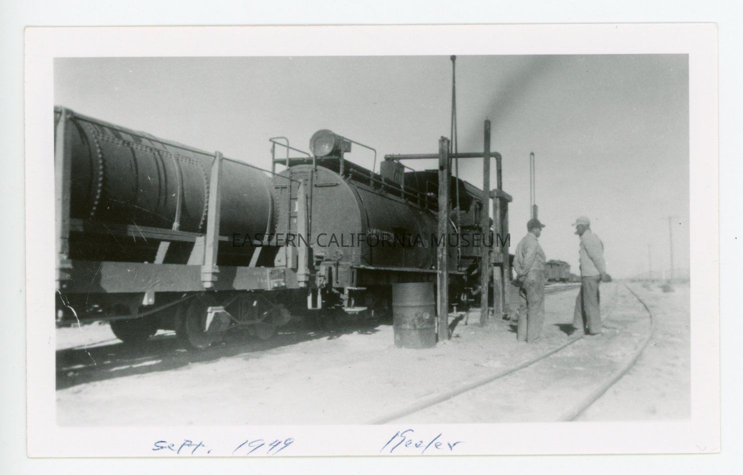 Photo of a Southern Pacific train engine and two men standing by tracks. It is labeled on the front in blue ink "Sept. 1949 Keeler."