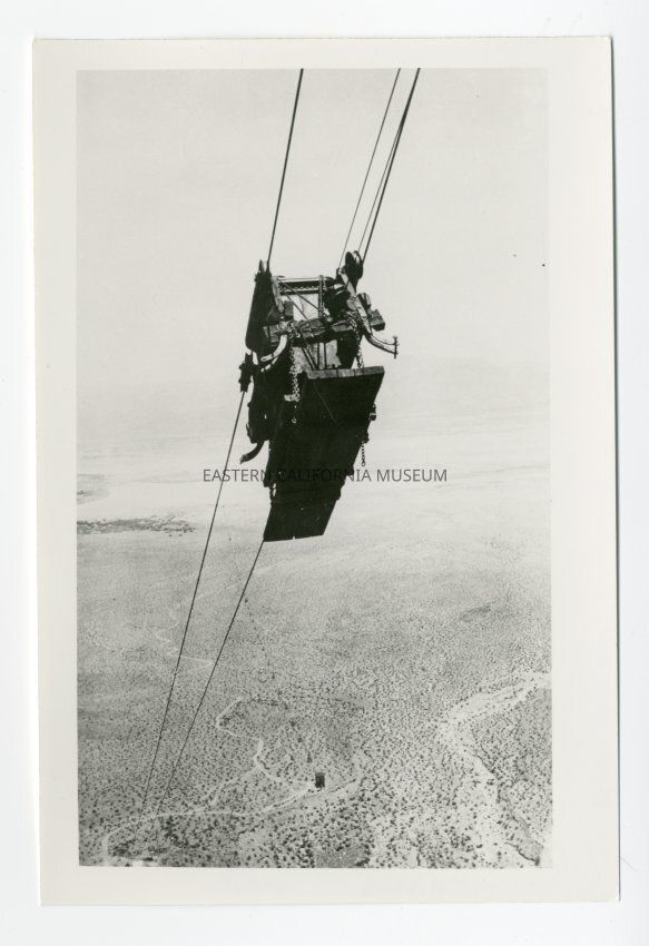 Photo of the Saline Valley Salt Co. aerial tramway cables and a wooden box-like creation. Possibly used to transport people or supplies to stations along the tramway?Collection