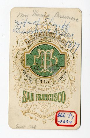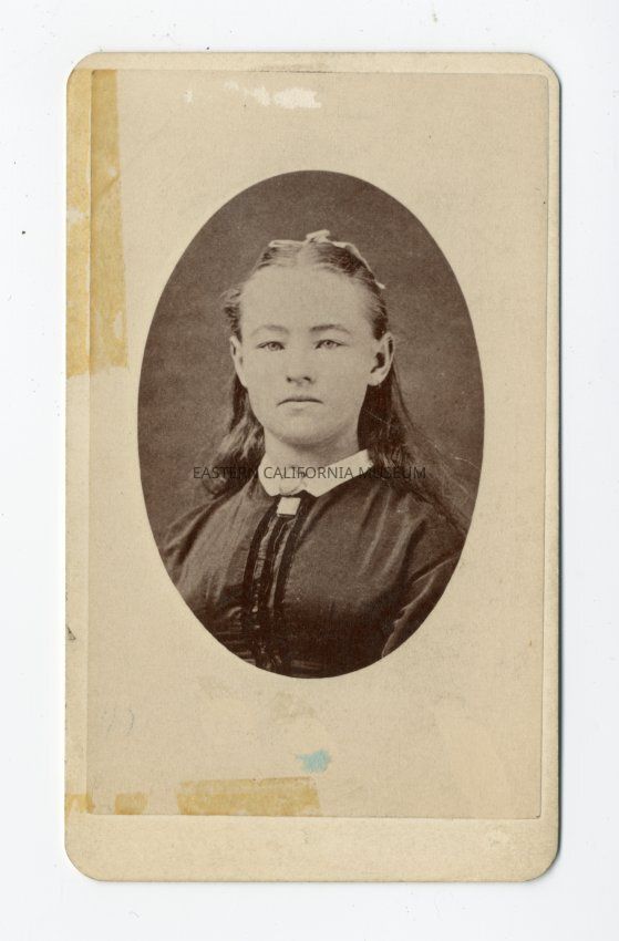 Mounted photograph of Tony Walker Passmore, the daughter of William [Webster?] Walker, an Olancha Pioneer, and the wife of Thomas Passmore, the Sheriff who was killed in the line of duty in 1877 [1878?] in Lone Pine, CA.