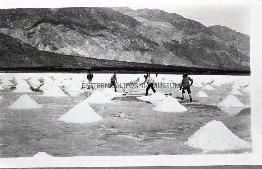 Photo of several men employed by the Saline Valley Salt Co. using shovels to create uniform piles of salt.Collection