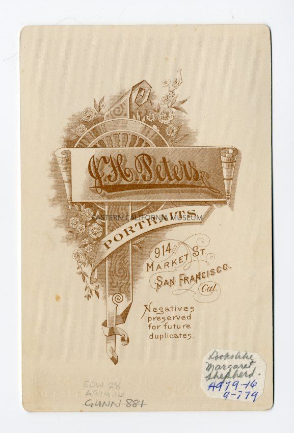 Mounted photo of Margaret Shepherd, photo taken later in life. Photographed by J. H. Peters of San Francisco.