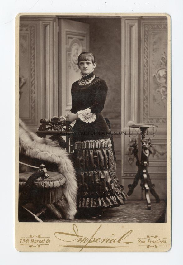 Mounted photograph of Minnie Lasky in 1882. She is photographed full length wearing a black dress with bustle, a high-necked ruffle collar, thick white lace around wrists, and white tasslework around neck and hips/thighs. Photographed by Imperial of San Francisco.Collection