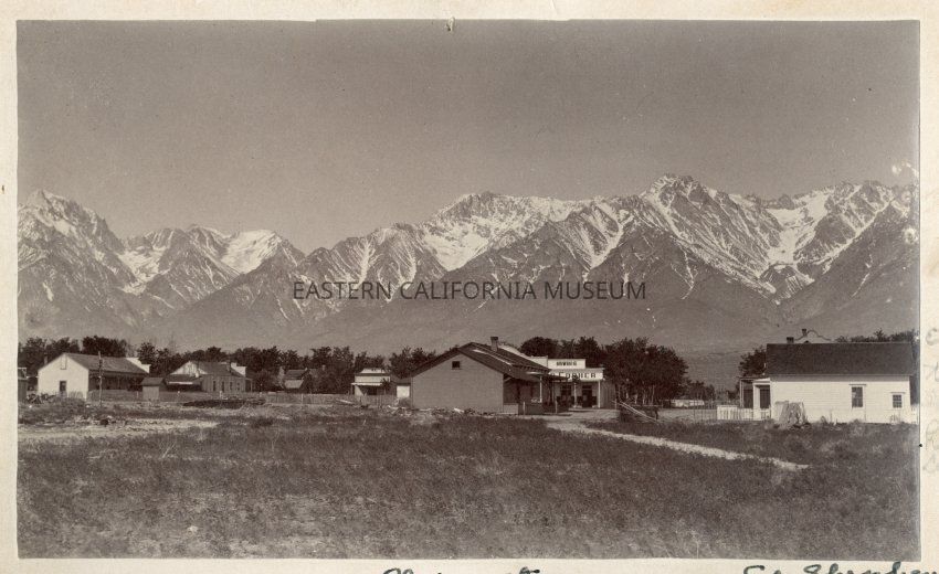 Mounted photo of the town of Independence taken from the east side showing the Rhine Store (backside?) and looking west toward the Sierra Nevada. Also visible is Irwin's [illegible--Old?] Corner.