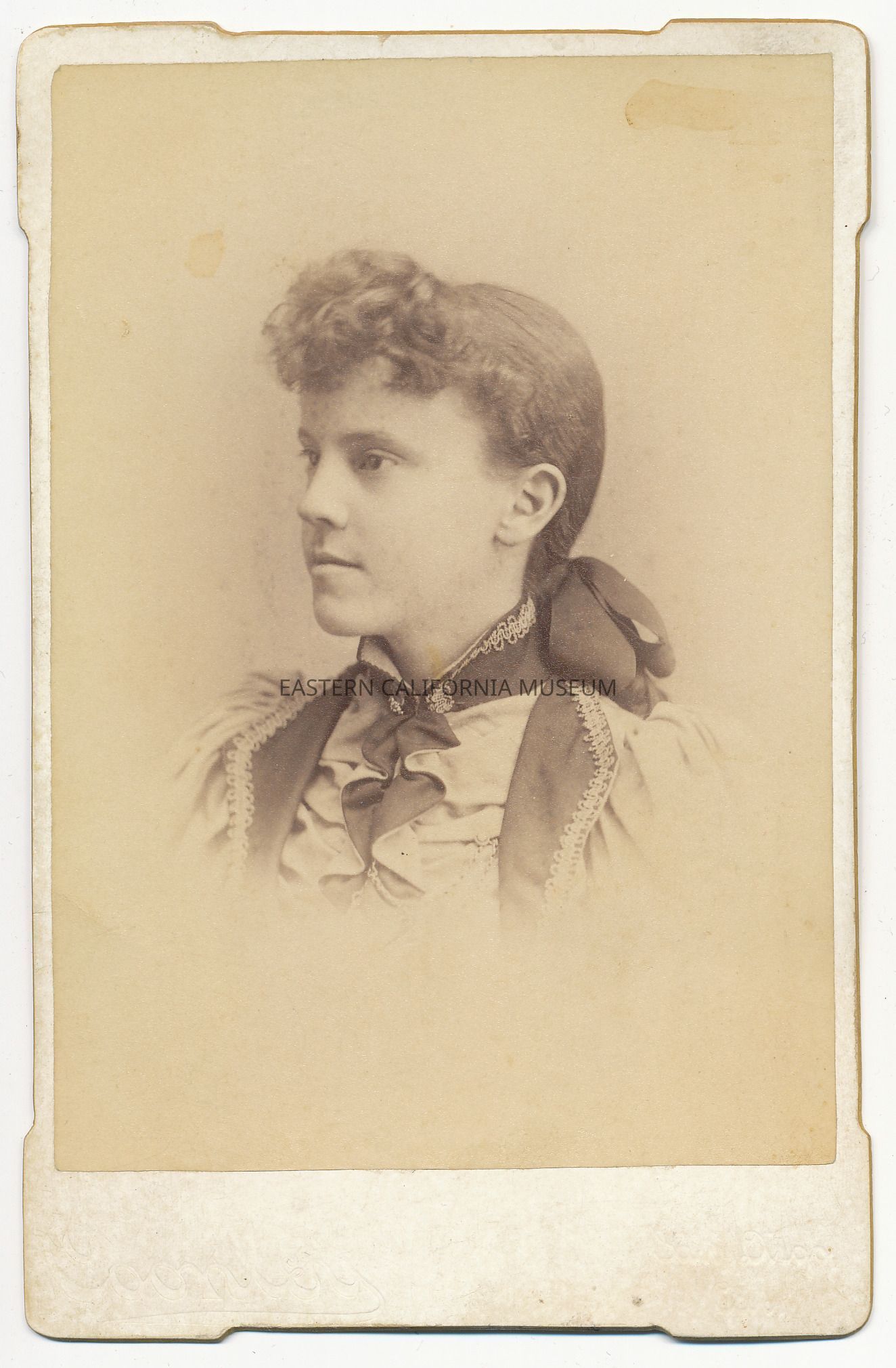 Mounted bust-length portrait of a young woman. Photographer is Coonley, San Diego, Cal. Writing in pencil and pen on reverse: Mrs. D. C. Weston / 2345 F St. / San Diego