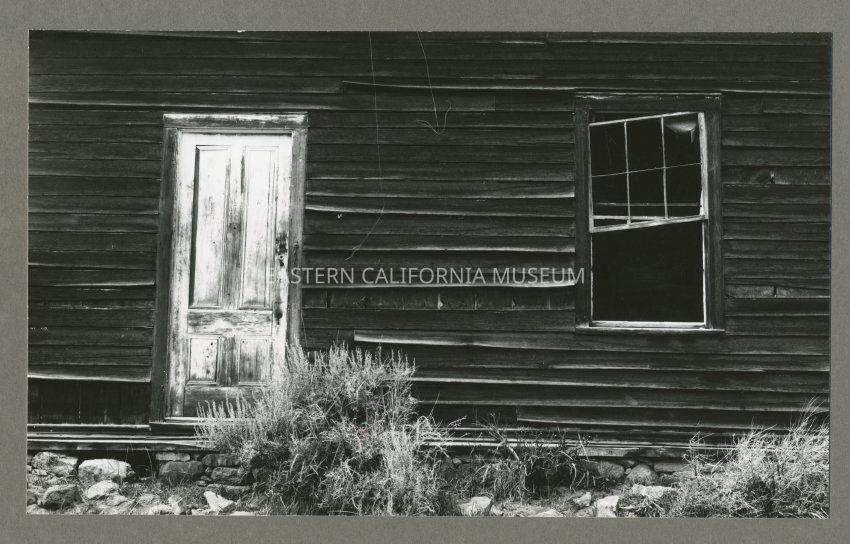 Mounted photo of an abandoned structure at Bodie. Door, window.