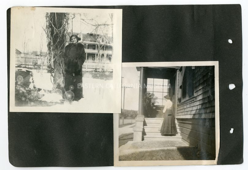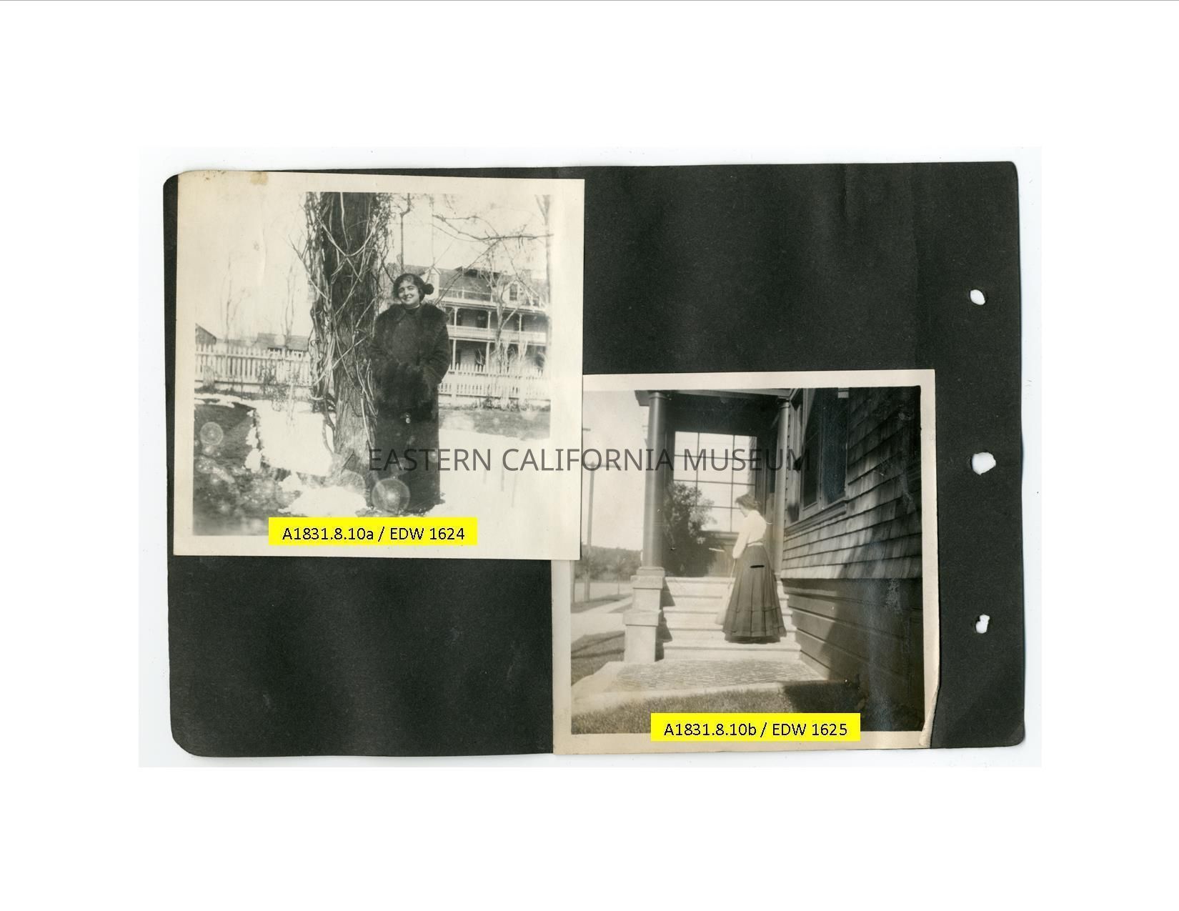 A1831.8.10a: Exterior photo of Helen Gunn wearing a full-length coat with fur trim in a snowy yard. The Norman House (hotel) is in the background.