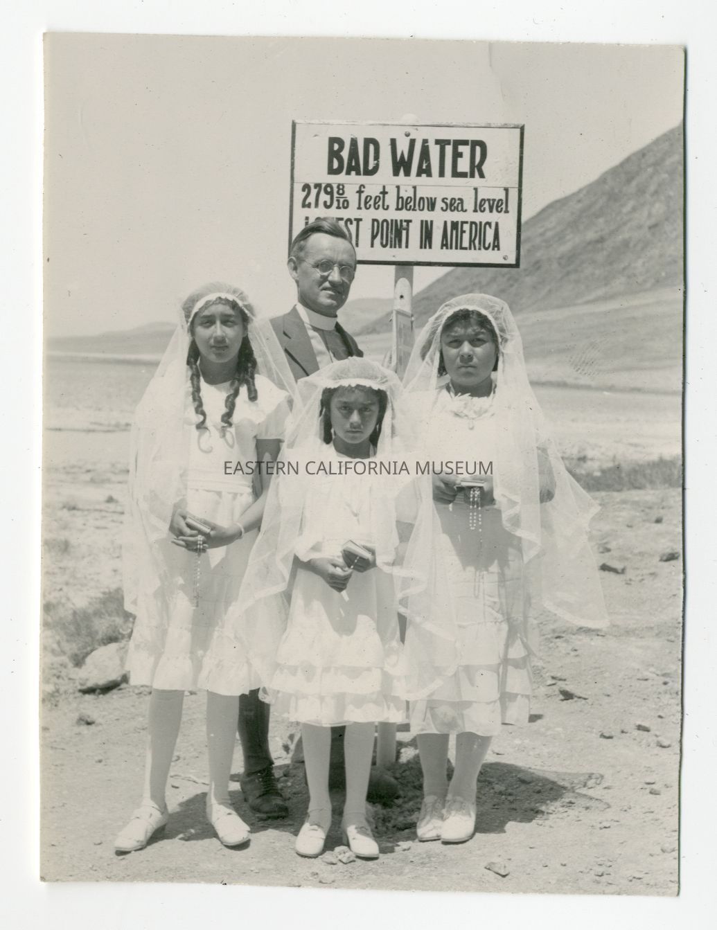 Exterior photo of Father John Crowley with three young girls in white First Holy Communion dresses. They are standing in front of a sign that says, "Bad Water. 279 8/10 feet below sea level. Lowest point in America."