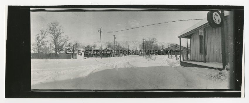 Copy of a panorama photo of Lone Pine in snow. The Mt. Whitney garage is visible as well as a bakery and restaurant.