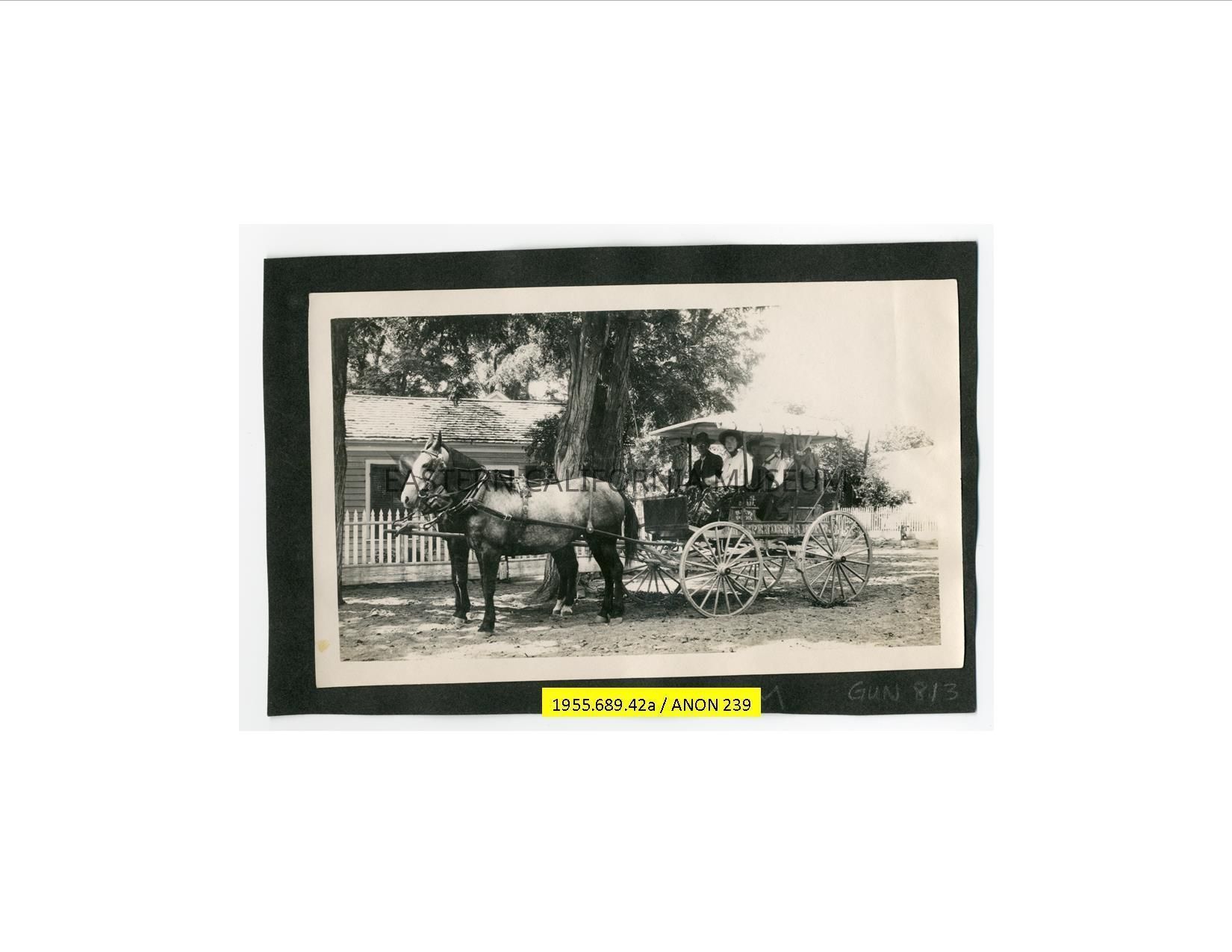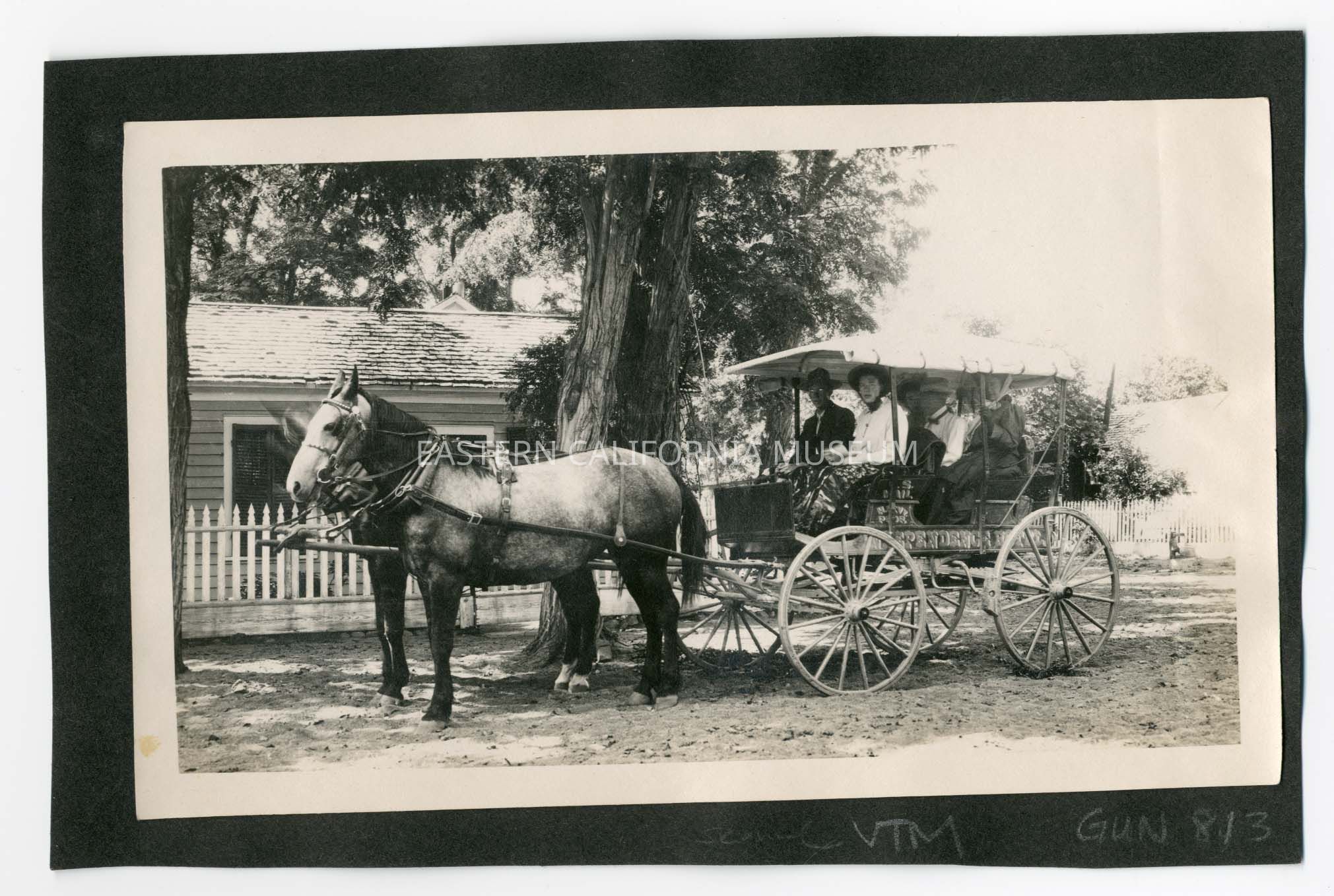 Photo of a horse-drawn covered wagon with five people seated in it. It is parked in front of the Shepherd house in Independence and it belonged to the Independence Hotel--likely used to ferry guests between the railroad station and the hotel.