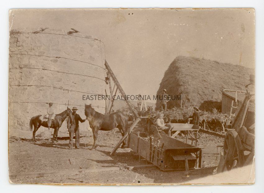Sepia toned mounted photo of men loading silage into a stone silo on the W. D. Roberts Ranch in Round Valley. The silo was built of blocks of tuff quarried in the nearby volcanic tablelands, and was reportedly the first silo built on the Pacific Coast. The silo was still there in 1971, but was destroyed by LADWP in the 1980s after sustaining damage during an earthquake. In the photo are horses, children, equipment, a huge pile of hay, wagons, an outbuilding, and a ladder.