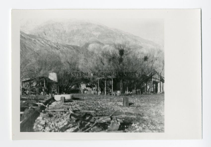 Photo of a structure, maybe a house and yard, likely built and used by the Saline Valley Salt Co.Collection