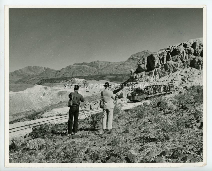 Photo of two people taking photos of people riding the baby gauge railroad at Ryan in the Amargosa mountain range.