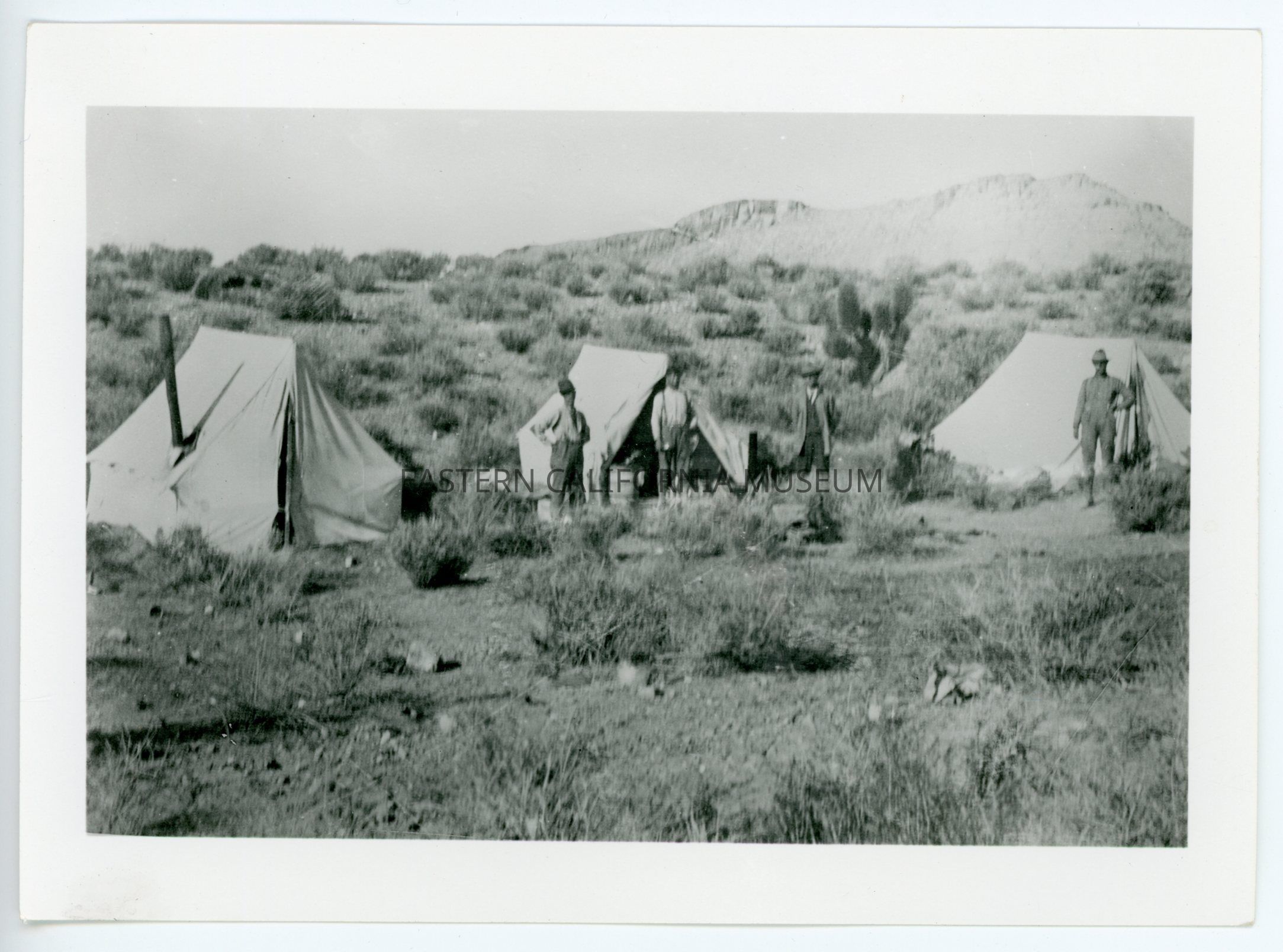 A617.1--Cook's camp in Transvaal Mining District (25 miles north and east of Beatty). Center tent with Mr. Geo. Cook standing in center of group. Other two tents people stayed two weeks then moved. Mr. Cook stayed 6 months. 1905.