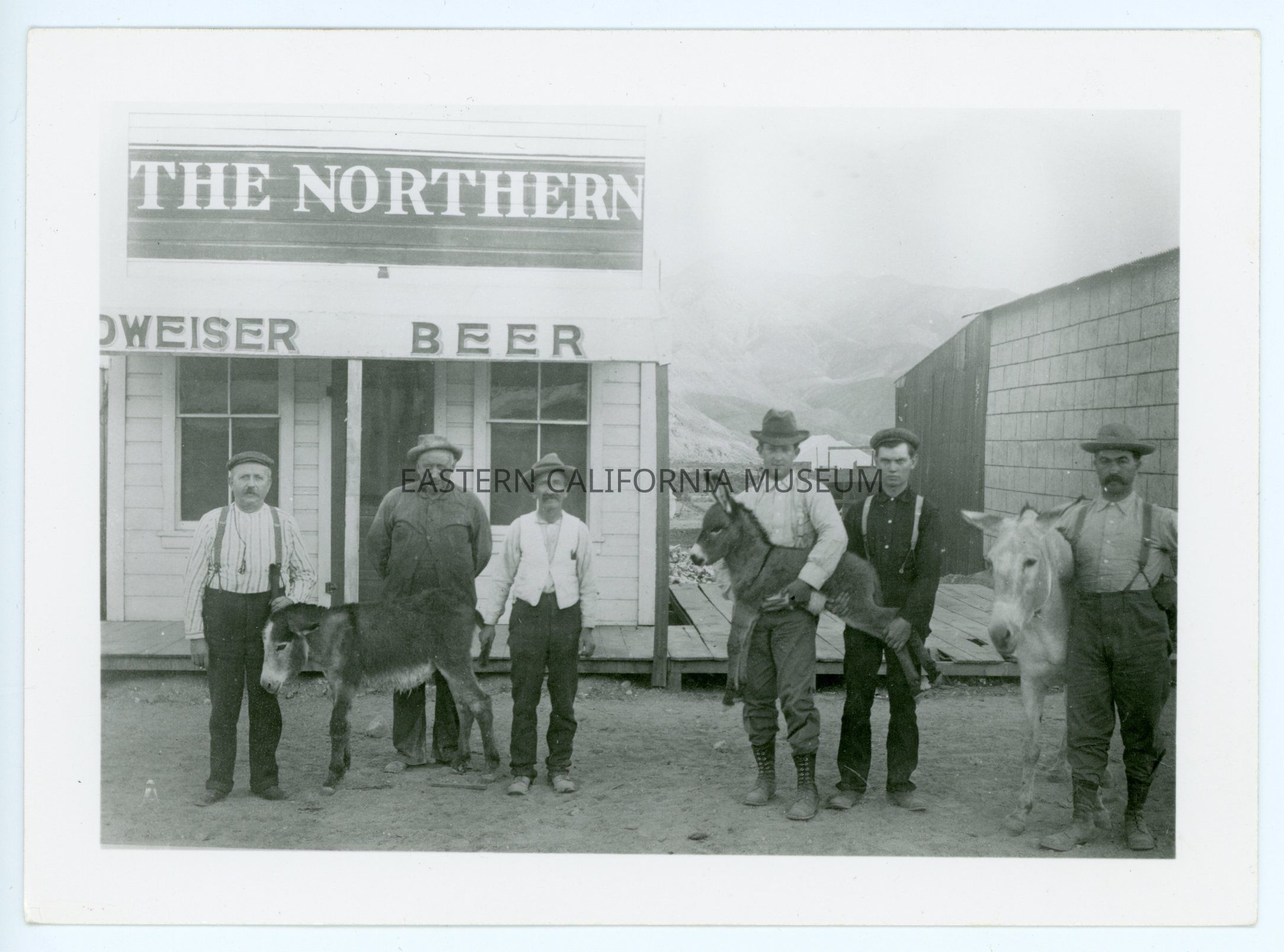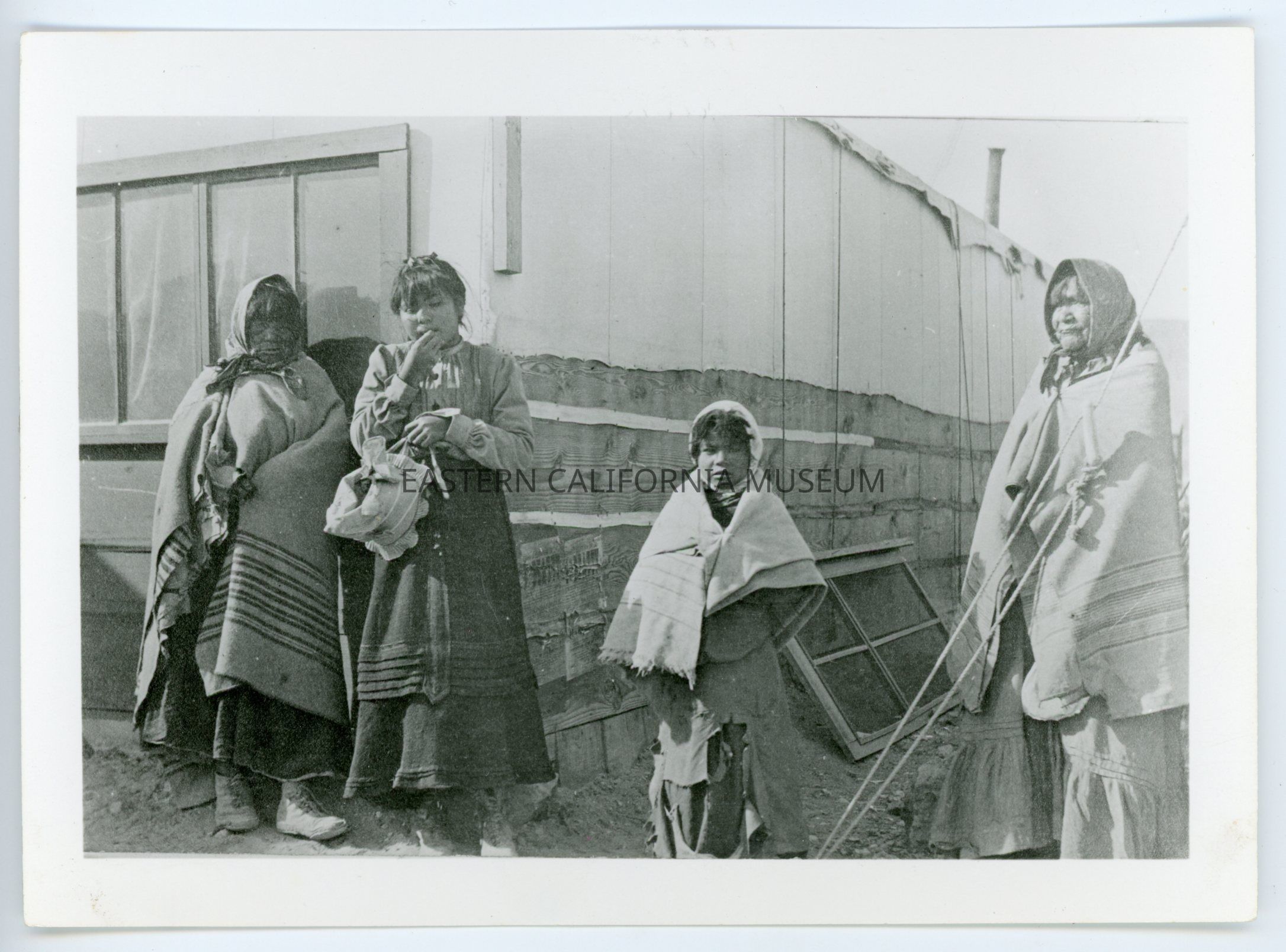 A617.14--1905. Indian women at bake shop in Beatty, Nevada. Gutheries run bakery. Mrs. Gutherie and her sister left Beatty on their way to Ballarat with Panamint Joe as guide. He died on the way (1910). The team gave out and they were out of water. Maggie, Panamint Joe's squaw, and their little girl walked to Emigrant Springs for water. Mr. Gutherie went for help to Skidoo. When he got there he was out of his head. Skidoo Mines team had a barrel of water in wagon went to hunt Gutherie women. Delmar Bob (called Randsburg) found them. Saw where women had crawled down over bank shading clothes. Took women back to Skidoo. Dr. McDonald took care of them for about a week. They were later taken to Ballarat.