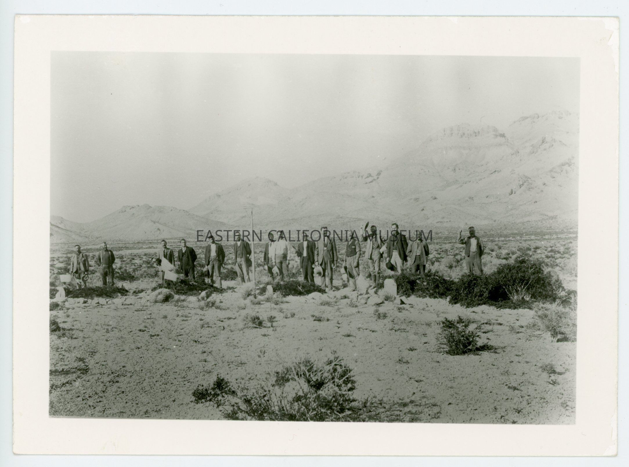 A617.4--First Decoration Day in Beatty, Nevada, 1905. Tom Devine third from the right. Sixth Charlie Sexton. Last Bob Hogland. Two men buried, one a civil engineer and Mr. Alexander (second grave) thrown from horse and killed. (Mr. Cook helped make coffins). First two men who died in Beatty.