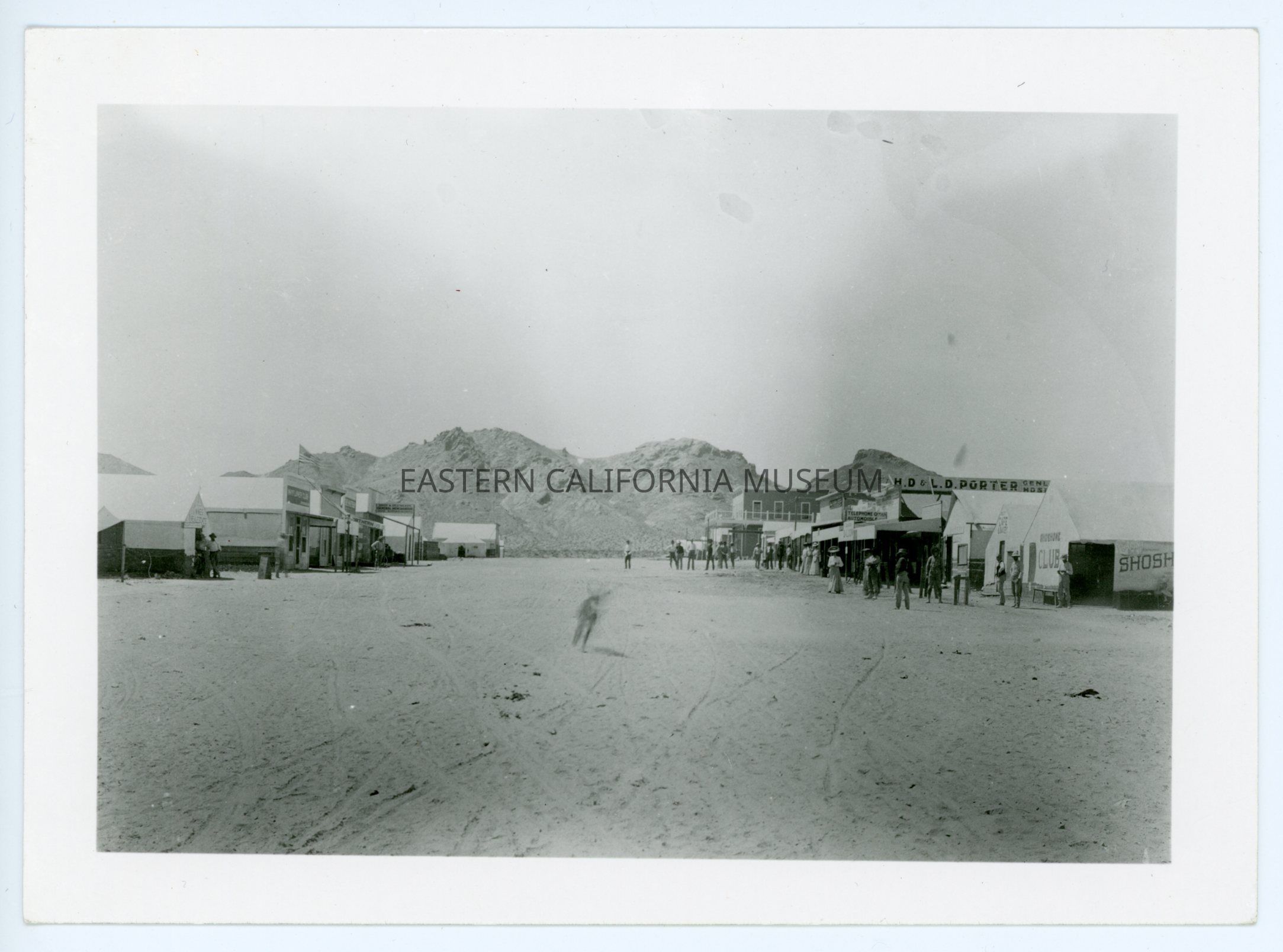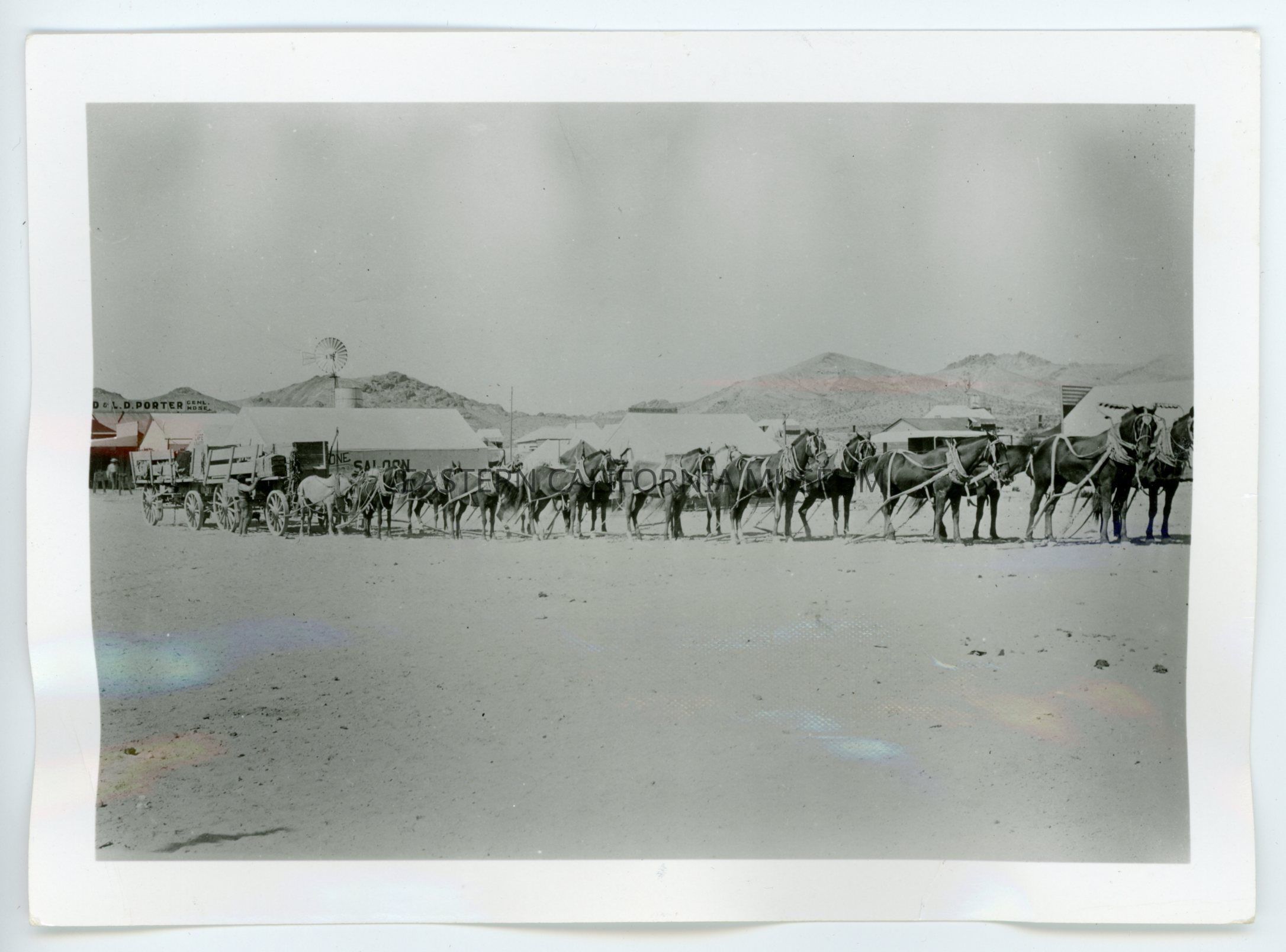 A617.13--H. D. and L. D. Porter's team. Main Street of Beatty, Nevada. Hauled from Las Vegas to Beatty. 1905. Porters had a dry goods store in Rhyolite (1906). Went Rhyolite and went to Phoenix called the "Western Store (after leaving Beatty).