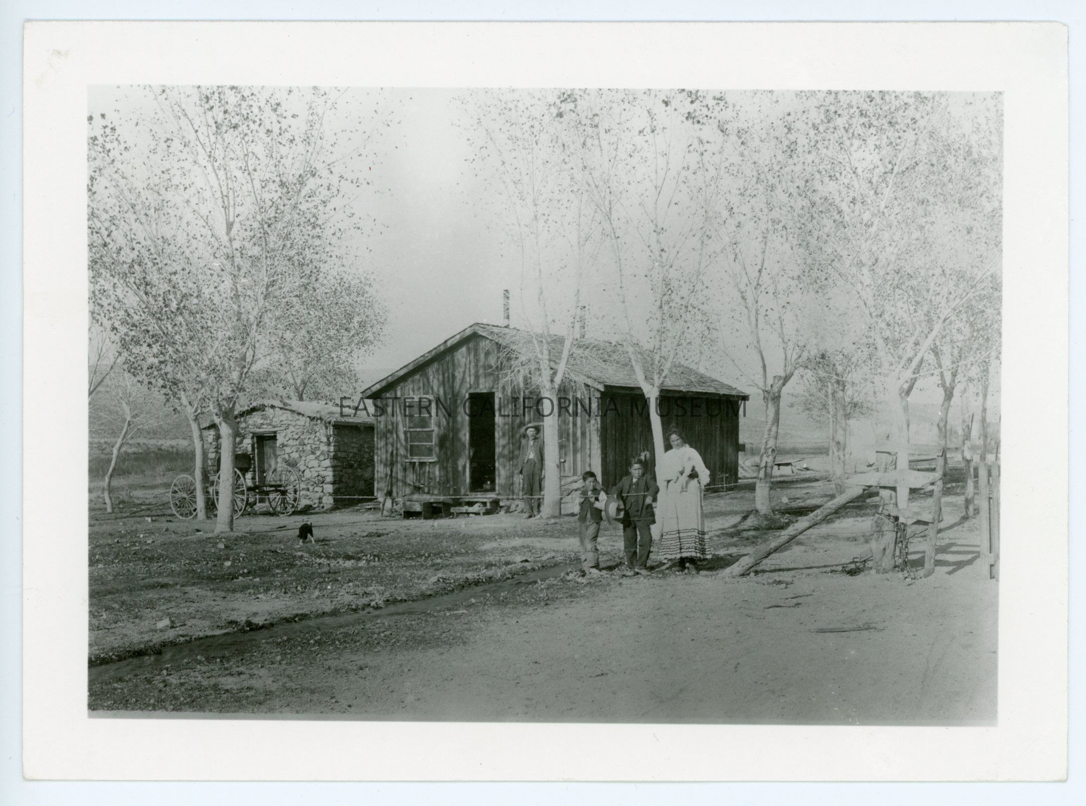 A617.9--Mr. Jim Beatty's little ranch. Had a few cattle. Hard times. Had to go to Pahrump 75 or 76 miles to get provisions. Took about 3 or 4 days trip one way. Mr. Beatty by door, girl his daughter Maude, son Frank and ? 1905. (Oldest Frank killed in France World War I)
