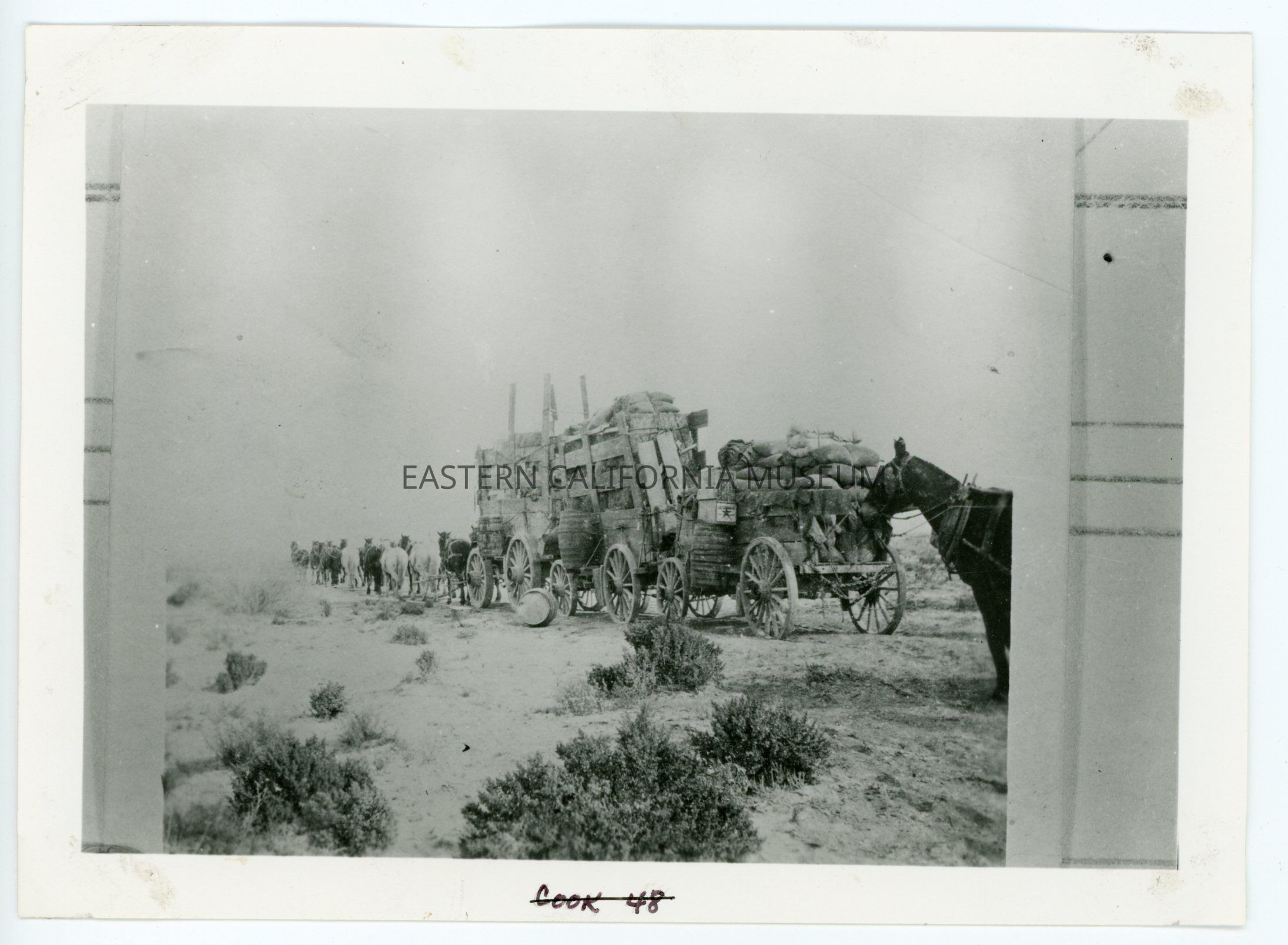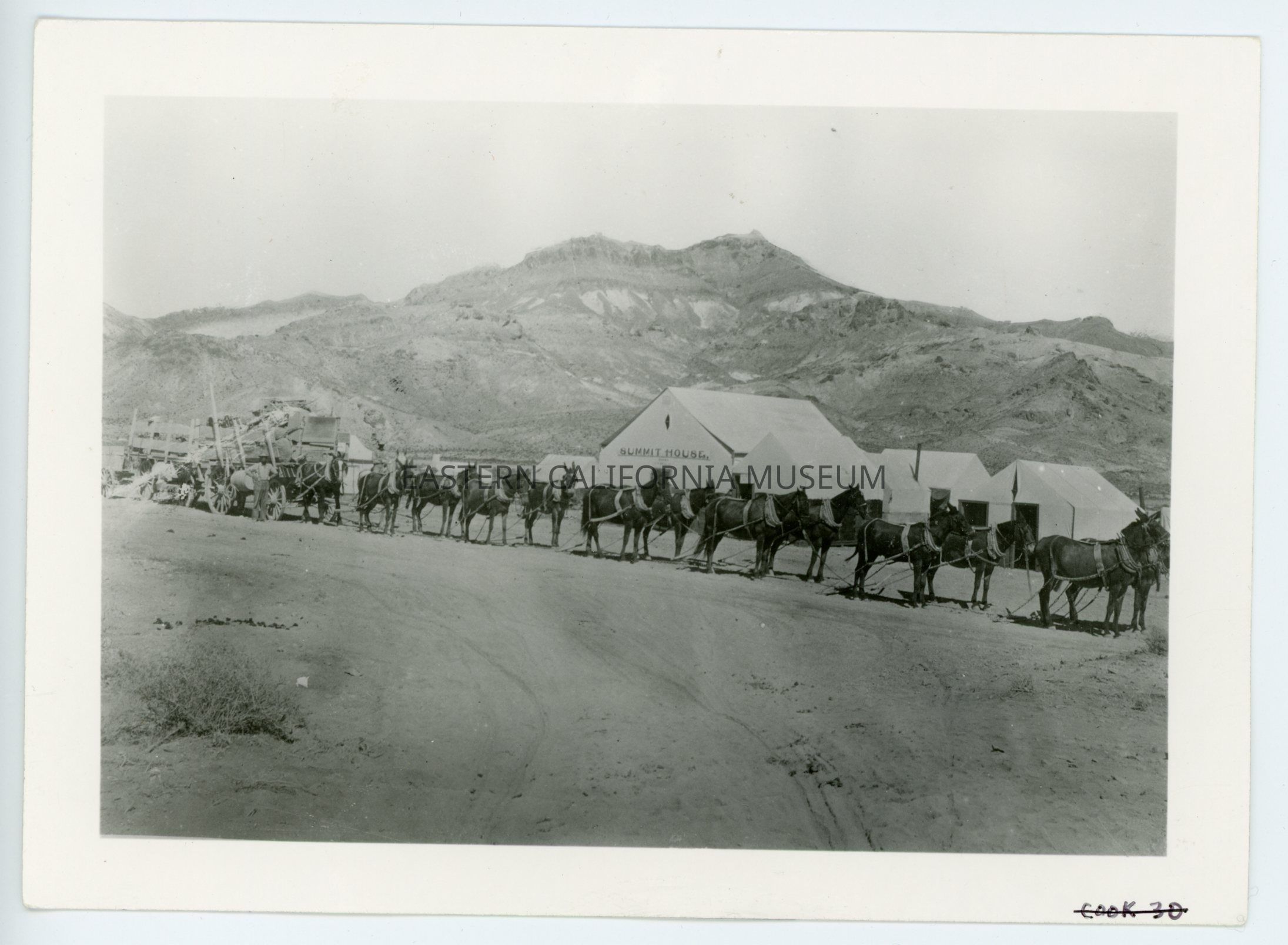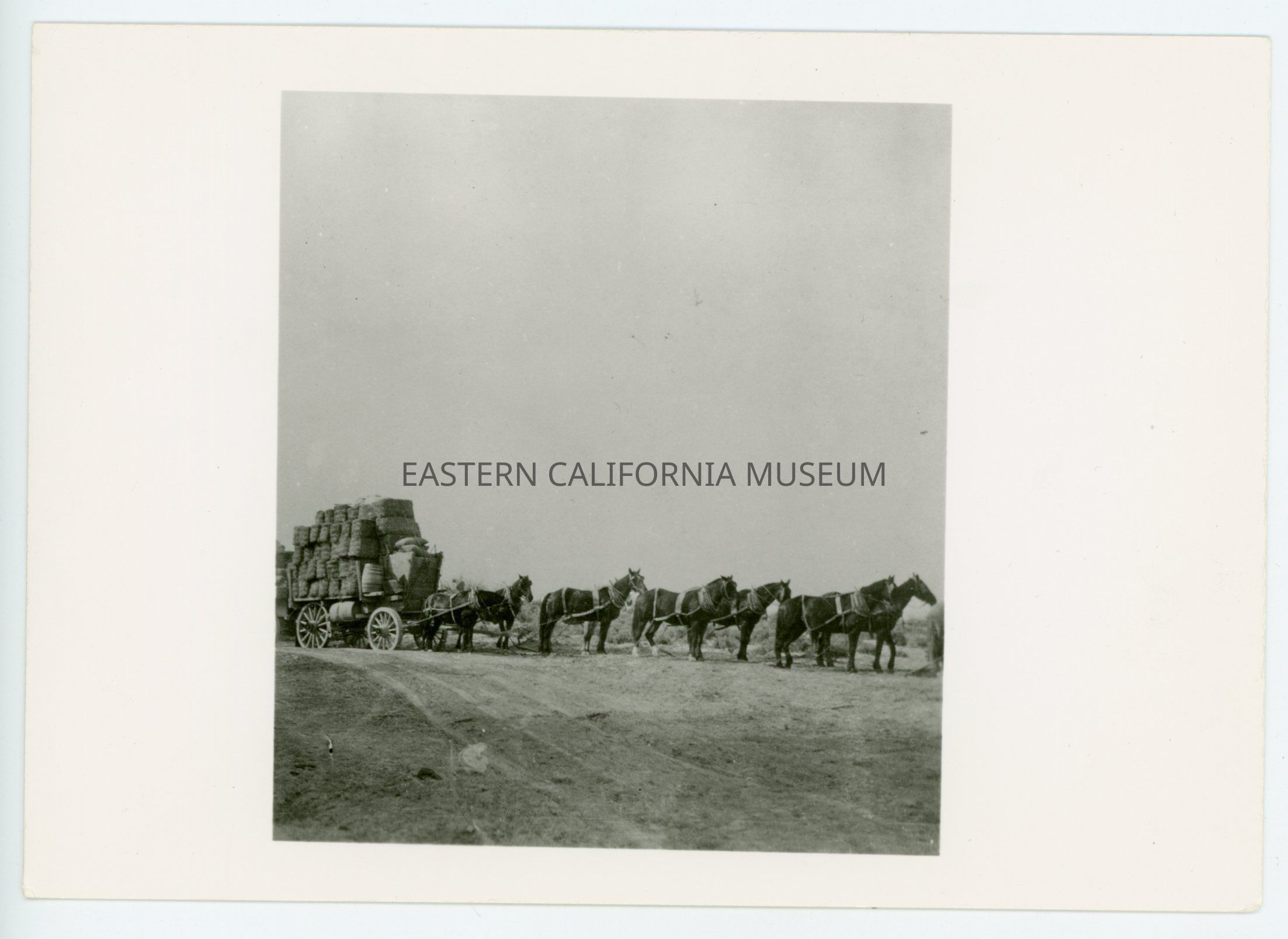 A617.10--One of the large freighting teams from Las Vegas to Beatty. (Las Vegas was end of Salt Lake-LA RR [railroad]). 4 or 5 tents there at that time 1905 (Feb). (Geo. Cook April 10, 1957) The depot was one of the first mail coaches ever built. We took 6 horse stage to Beatty, Nevada 125 miles and ten on stage including driver. 9 of us 2 1/2 days without anything to eat (they had to feed driver, no food for others). Stations about every twenty miles. 3 days from L.V. to Beatty. 30 days for freight teams. [Hauling a load of hay.]