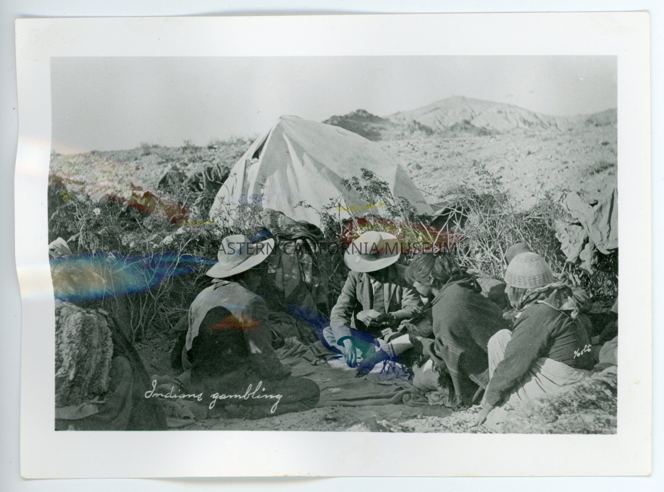 A617.16--Indians gambling at Beatty, Nevada, on Armagosa River. Home was tent. 1905. (Note basket hat on squaw.) Shoshone and Paiute [illegible]. [Photo is titled "Indians gambling" and the photographer is "Holt" or "Nolt."]Collection