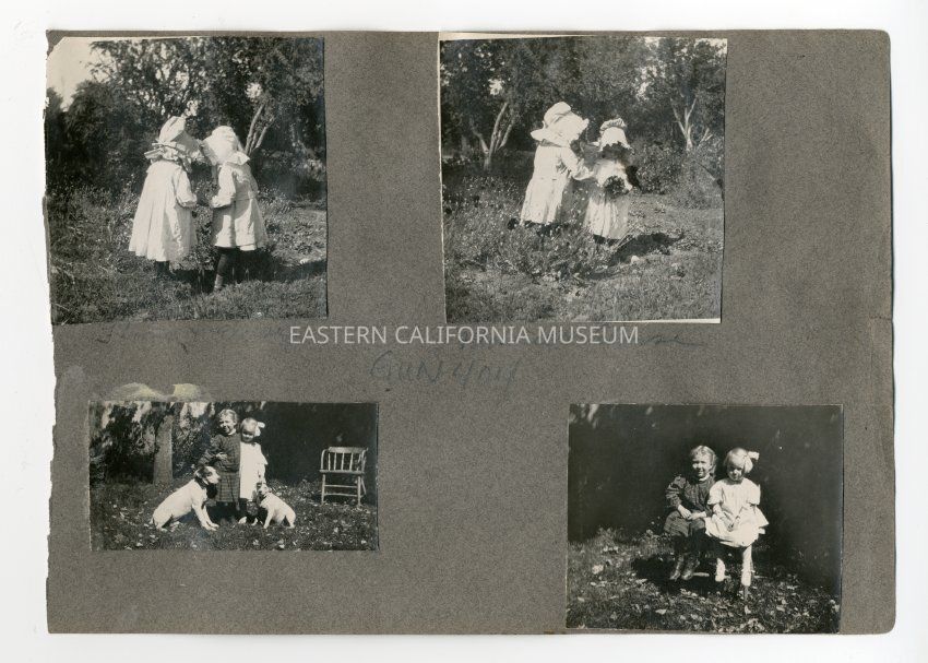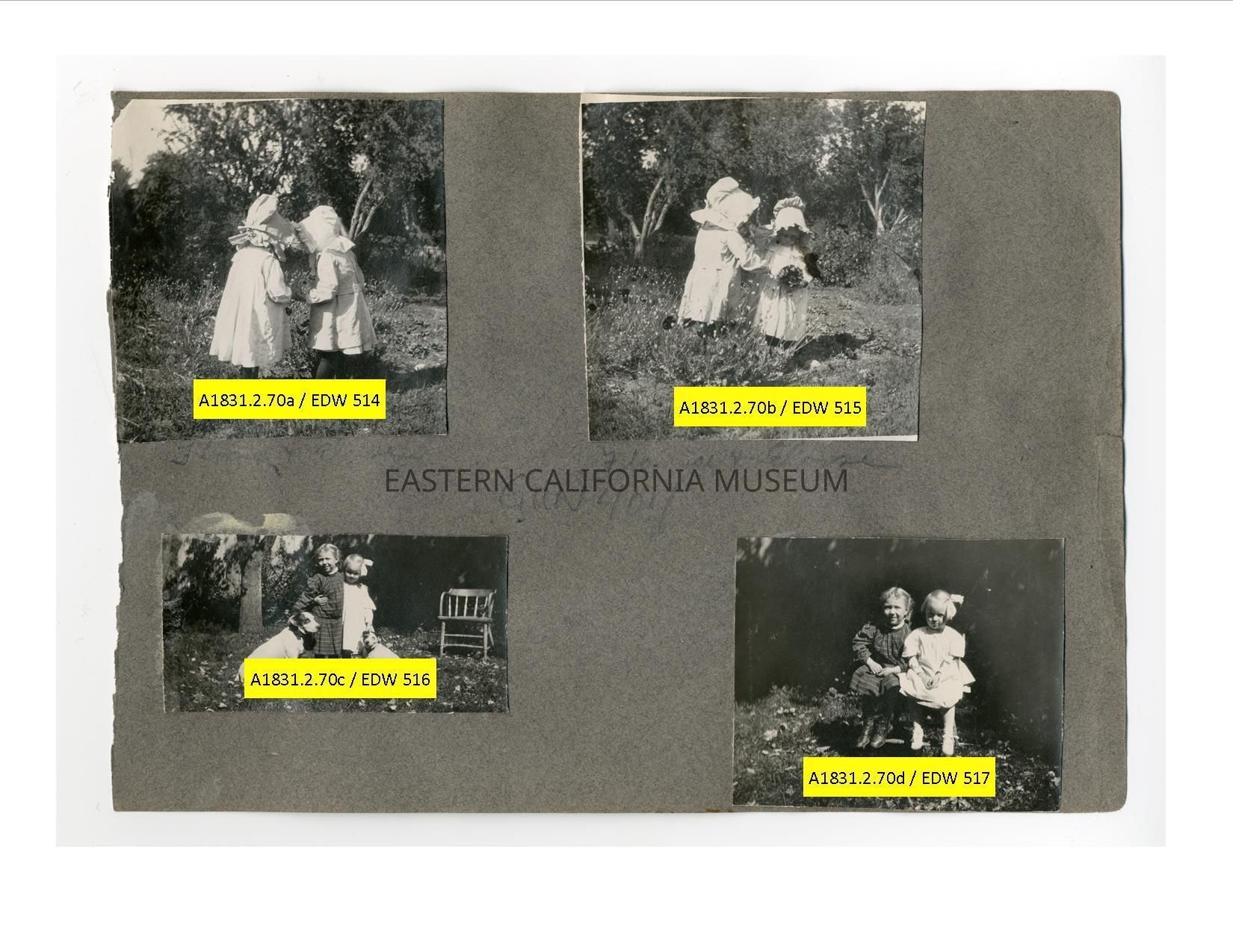 A1831.2.70a: Exterior photo of two little girls in a garden. They are identified as Florence and Eloise (Shepherd?).