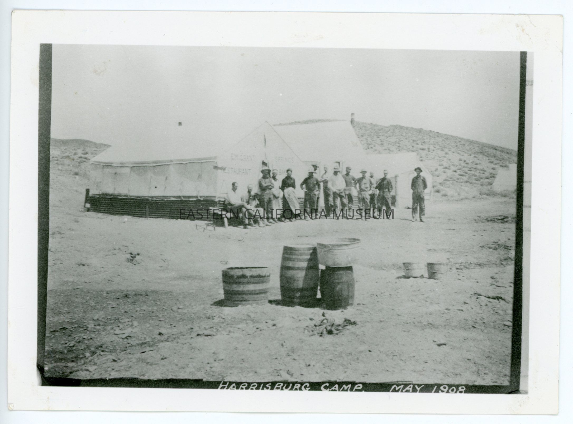 A617.18--Harrisburg Camp. Shorty Harris' mine (Emigrant Springs restaurant moved up there). May 1908. Part of old mill left there [illegible 1957]. Shorty Harris and Pete Auguerreberry were partners. Shorty wanted to sell. Pete did not want to sell, so they divided the hill. Shorty took south half and Pete took the north half. Shorty got a thousand dollars when his share was sold. [Titled "Harrisburg Camp, May 1908."]