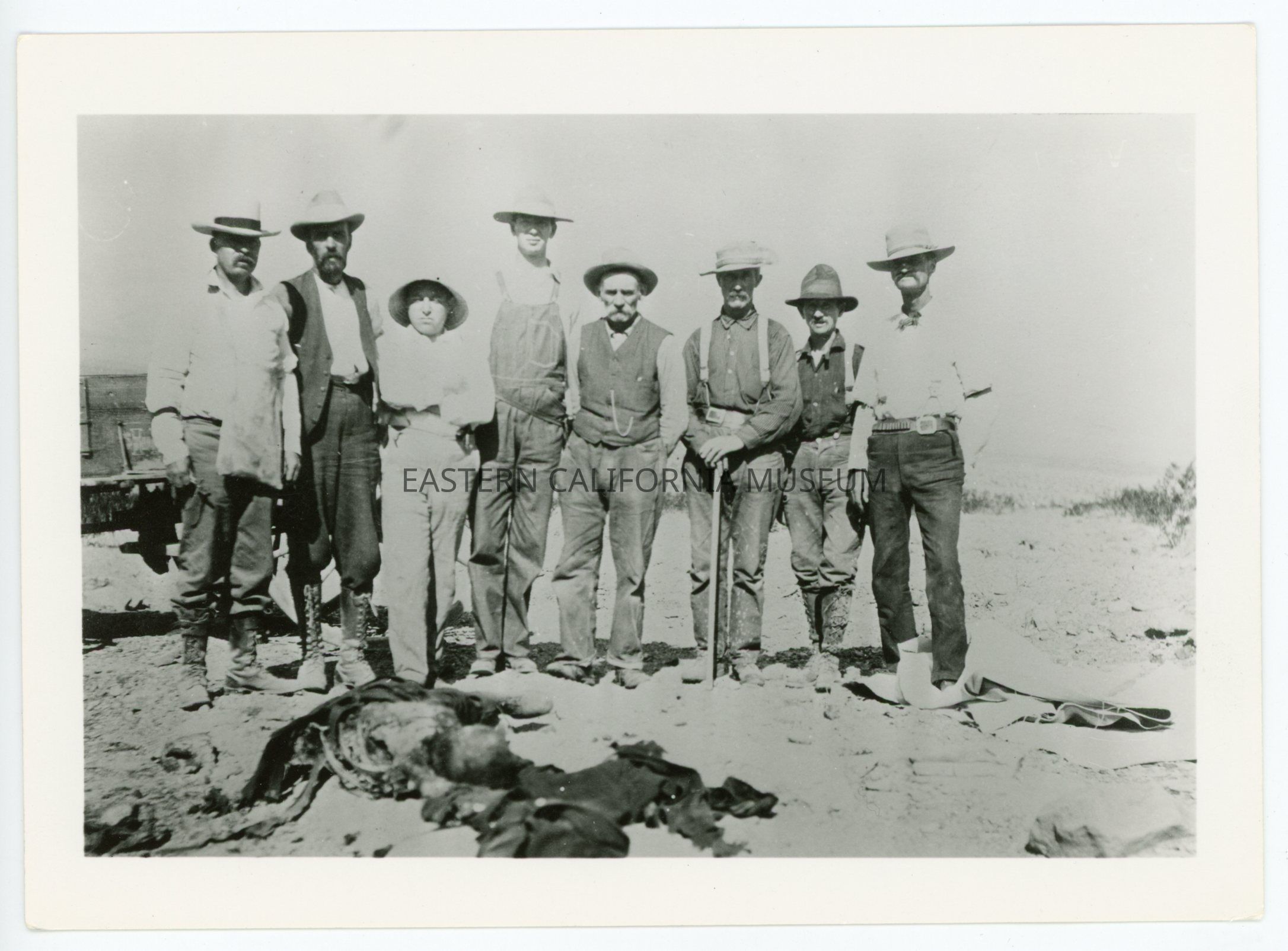 A617.19--Tommy Floss perished in Death Valley in August 1909. (Left to right Frank Thissie, Dr. McDonald, Frank Theyer [Fluger?], Casey, Jimmie, McConnal, Fred Heathe, Henry Sellers, Dick Hibbard (Hibbard found body).