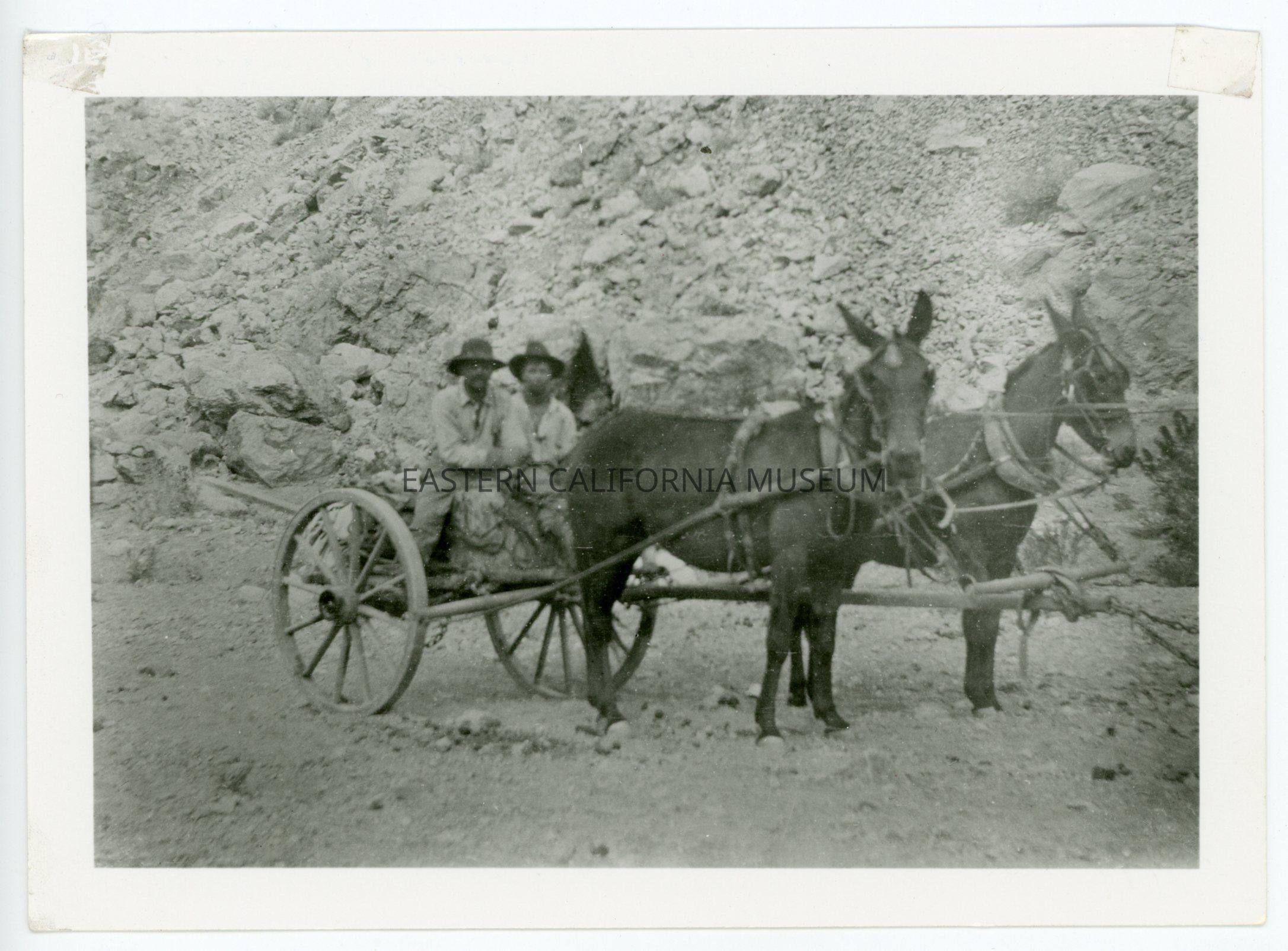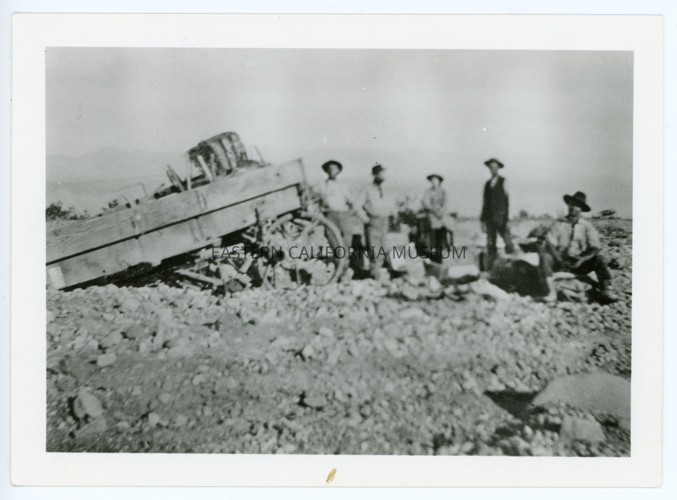 A617.22--Mr. George Cook's first trip, Sept. 1906, across Death Valley. At Black Point (north end of Panamint Range) were Emery Bodge and Tommy Floss perished. Wagon broke front wheel on fifth day. "Took us two days to get to Stovepipe Springs on the east side of valley and two days to Black Point. The morning of fifth day at 9 o'clock broke down. We got to Emigrant Springs at six o'clock in the evening." (See other picture. Information Geo. Cook, Lone Pine, Calif. April 10, 1957.)