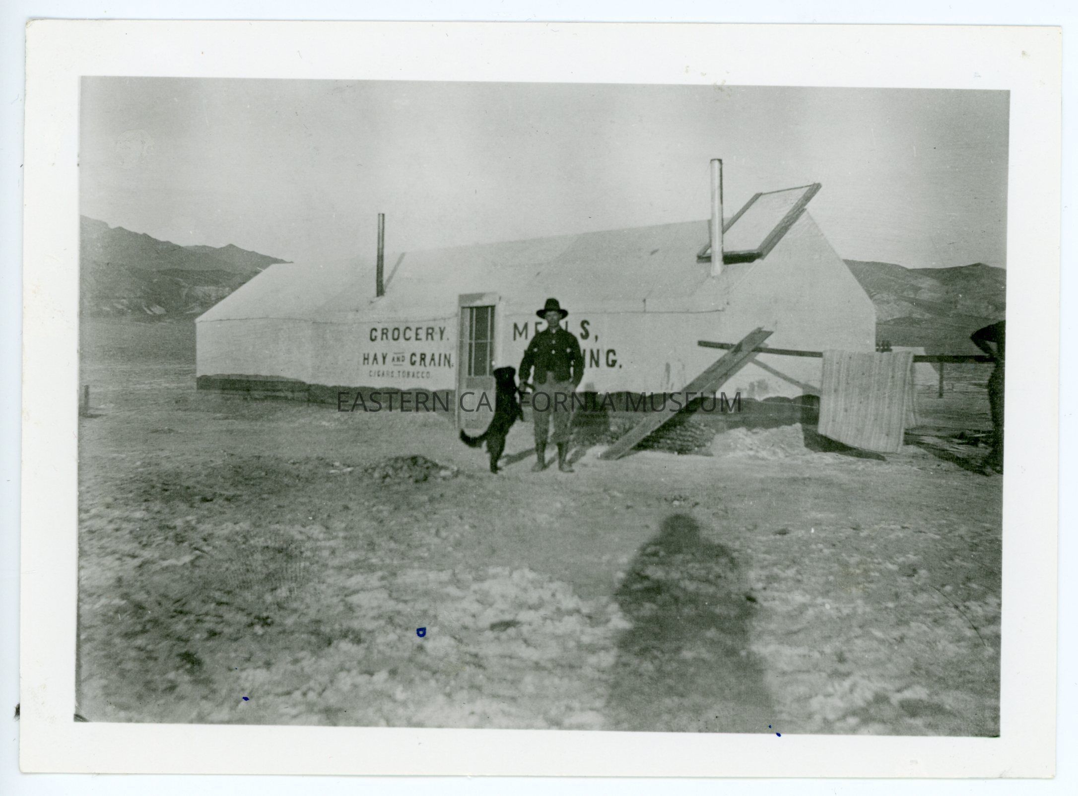 A617.24--George Cook at Stovepipe Springs on the east side of Death Valley. Cook walked from Skidoo to Beatty, 65 miles and was on way back to Skidoo when this picture was taken in January 1907. (Cook house. Notice vent over range next to the stove pipe. Meals were served here.)Collection