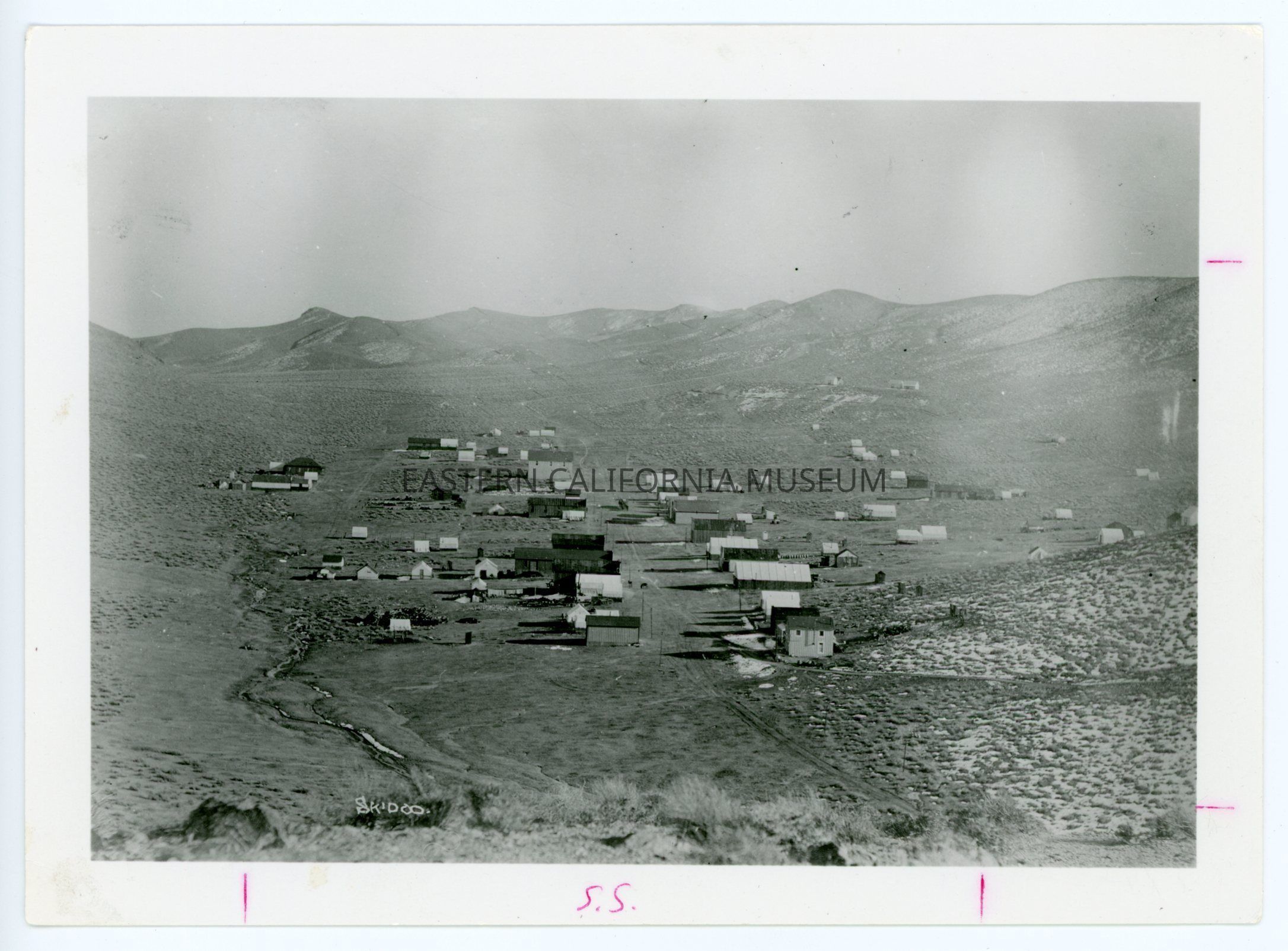 A617.25--Skidoo in 1907. Geo. Cook's tent in extreme left hand corner. Skidoo lasted about 10 years. 1908 largest population--700 people. (One little cabin left at old town site 1957) [Red marks and "S.S." on front of photo. Photo titled "Skidoo."]