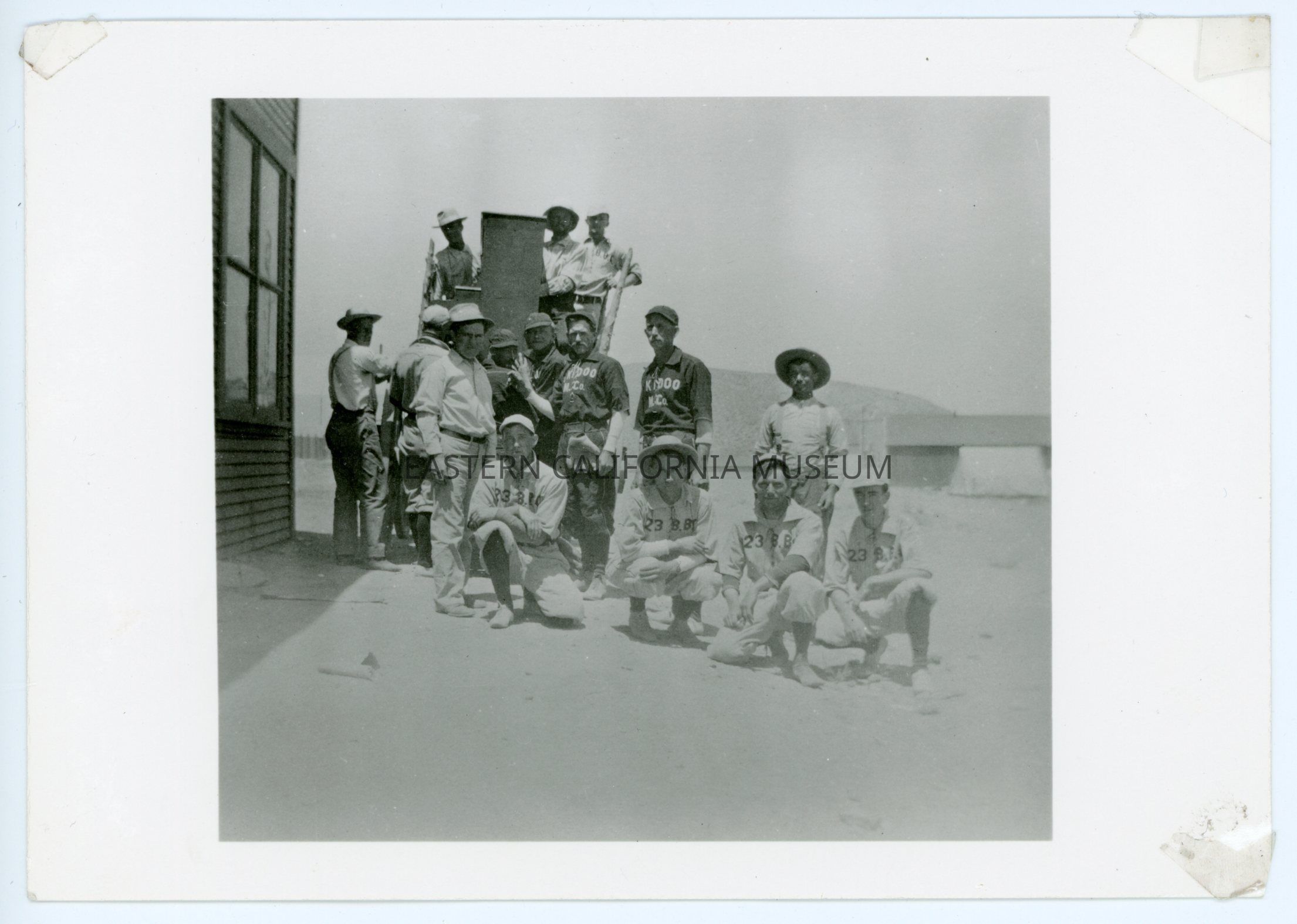 A617.26--Fourth of July 1907. George Cook first in back row (right to left). Moving a piano to the Hall. Held the dance there. Part of Skidoo Ball team helped load the piano. Skidoo. [Some of the baseball players' shirts say "Skidoo M. Co." and others have "23 B.B.C."]