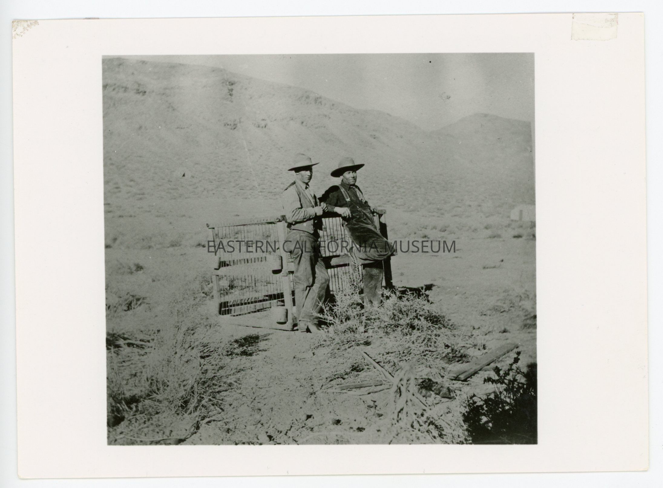 A617.29--Joe Grundy and Jim Arnold 1908 at Skidoo (leaning on chicken crate). Jim Arnold was killed by Joe Simpson. (Joe Simpson was hanged fourth night after the killing.) Arnold had one brother in Cripple Creek, Colorado. He was very fine character. (Geo. Cook information April 10, 1957) [Joe Grundy on left, Jim Arnold on right.]