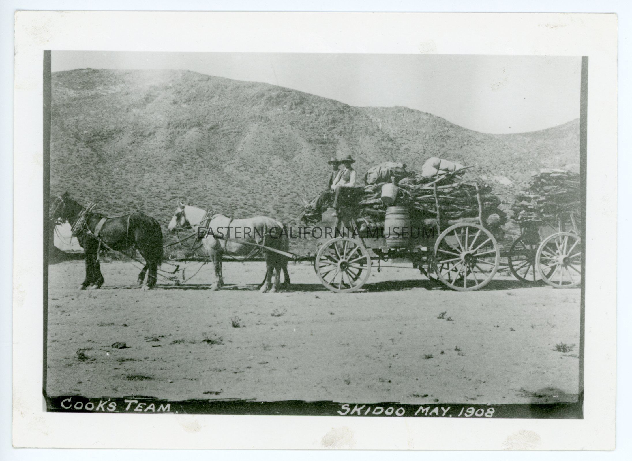 A617.30--(Happy) Cook's team. Geo. Cook on left side. At Nemo Canyon about 12 miles from Skidoo. May 1908. (Mexican who cut wood is on wagon with him.) [Photo titled "Cook's Team, Skidoo, May 1908."]