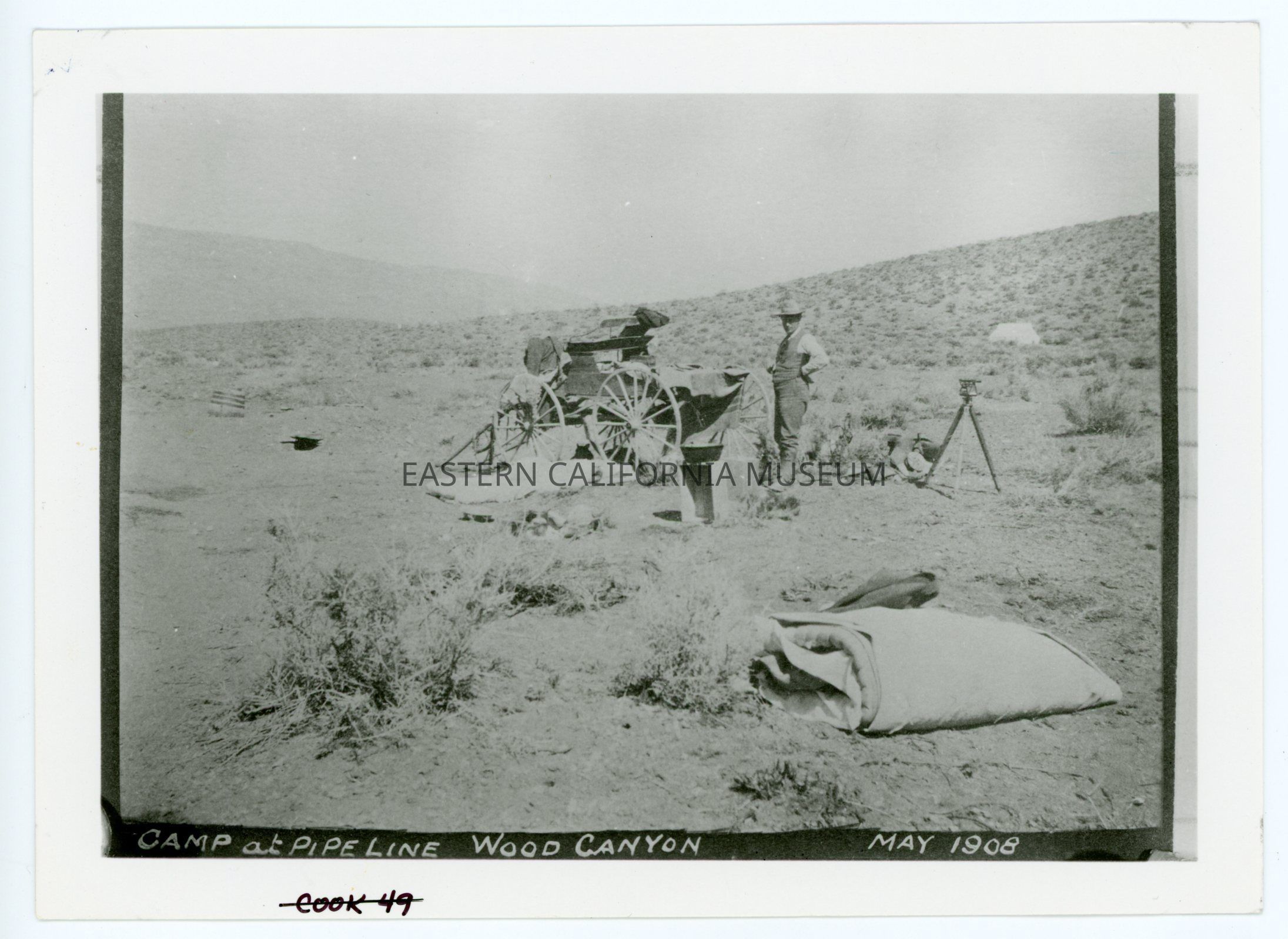 A617.31--Carl Glasscock at Wood Canyon. Camped on pipeline to Skidoo. (Faucet in pipeline so anyone could get water) May 1908. [Photo titled "Camp at Pipeline, Wood Canyon, May 1908."]
