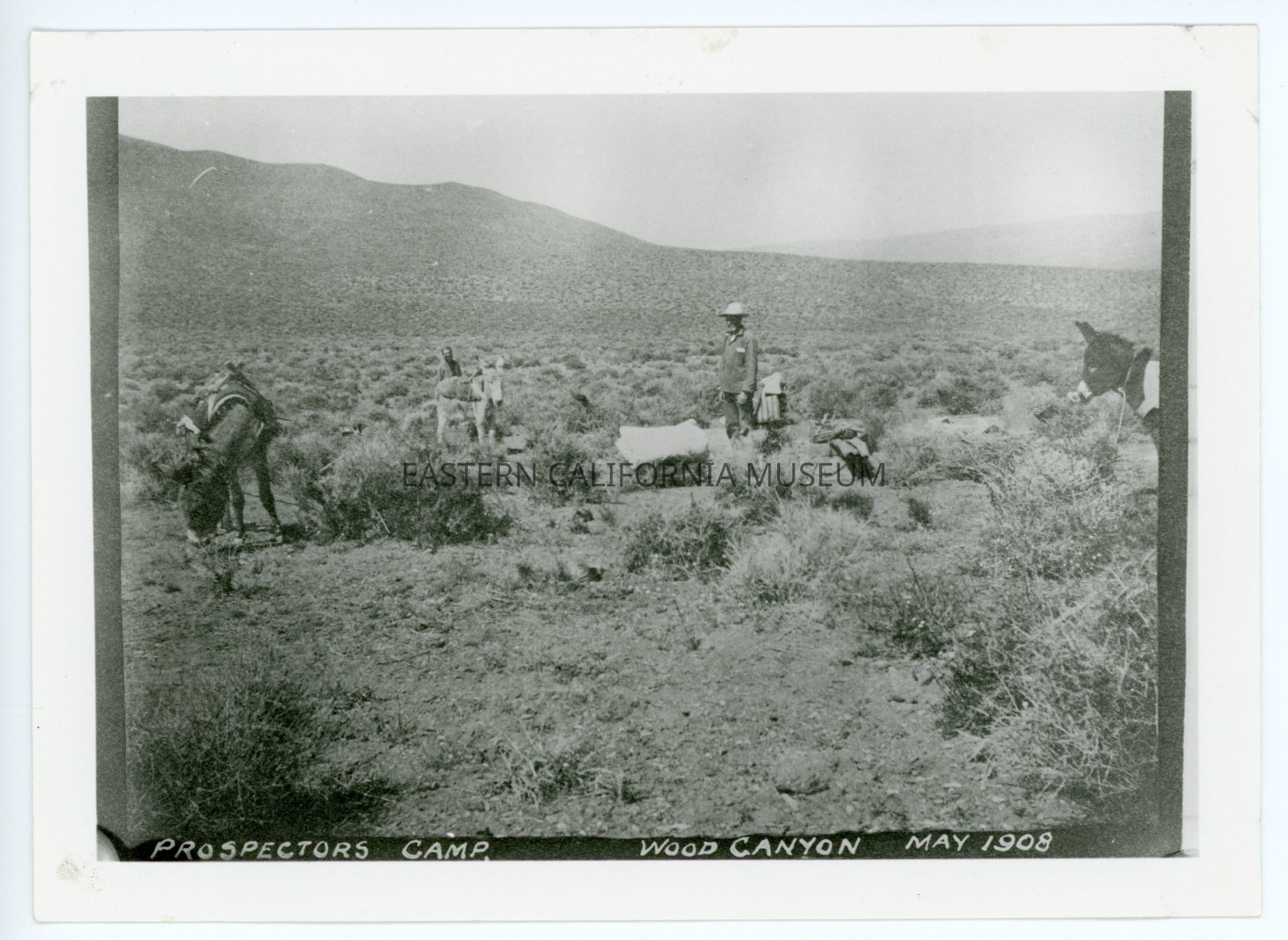 A617.32--Mr. Hall's prospector camp. Wood Canyon. May 1908. Mr. Hall in right center. [Photo titled "Prospectors Camp, Wood Canyon, May 1908."]Collection