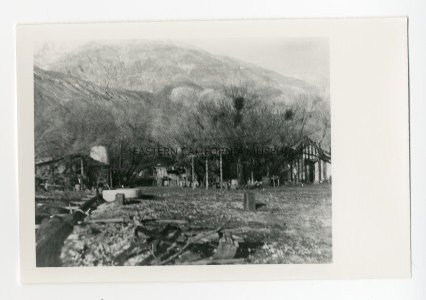 Photo of a structure, maybe a house and yard, likely built and used by the Saline Valley Salt Co.Collection