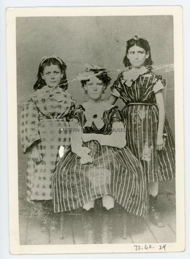 Old interpretative label says: Three older children of pioneer Charles Meysan and Madeleine Gaudin Meysan. The Meysans came to Lone Pine in 1869. Left to right: Zelia Meysan, born February 27, 1864; Blanche Meysan, born October 7, 1859; and Marie Meysan, born November 3, 1860. This picture was taken in Columbia, California.