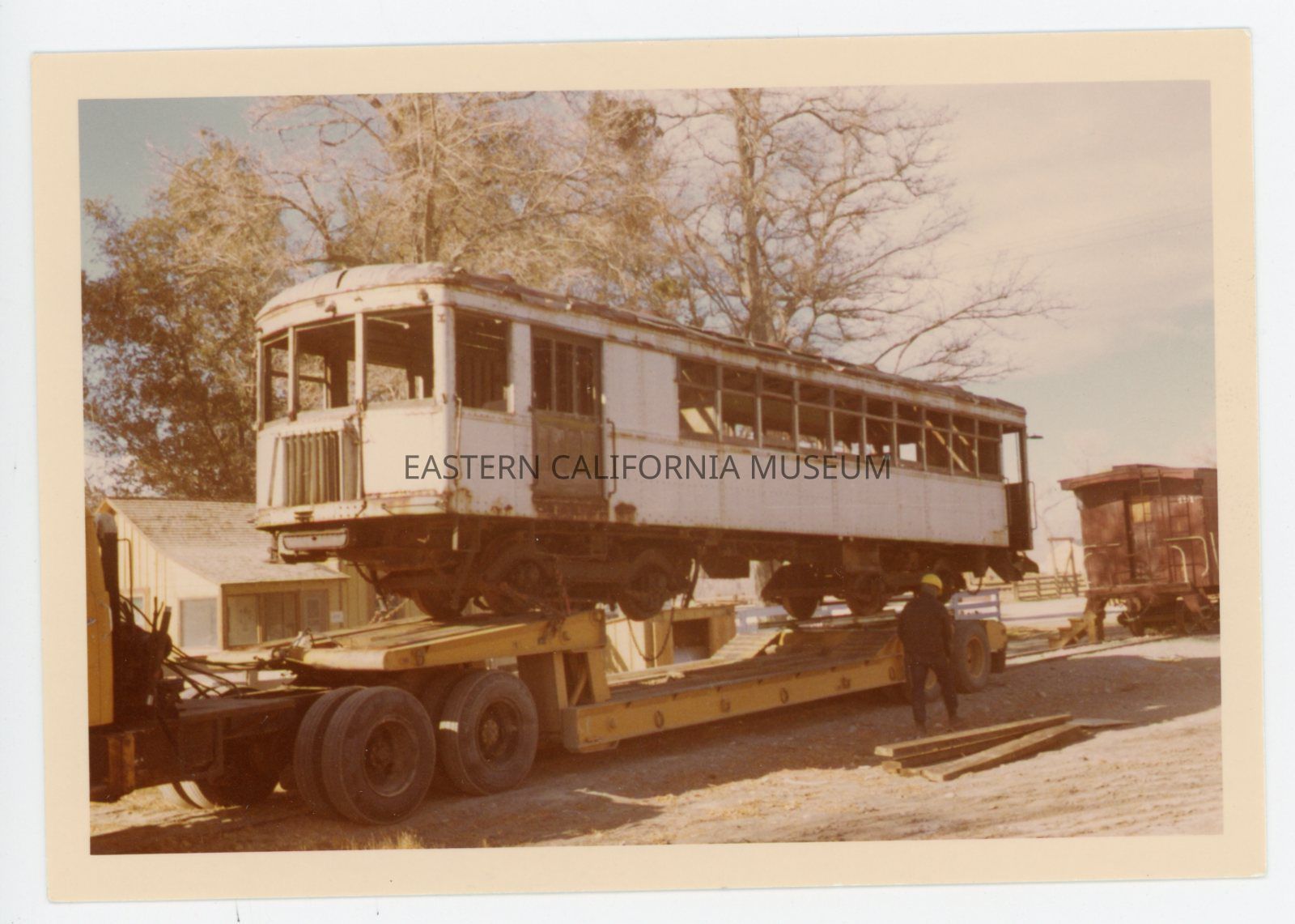 1991.27.1.45--Color photo of a flatbed truck hauling a train car (the Galloping Goose or Blue Goose?). There is a man walking beside it and a red boxcar in the background.